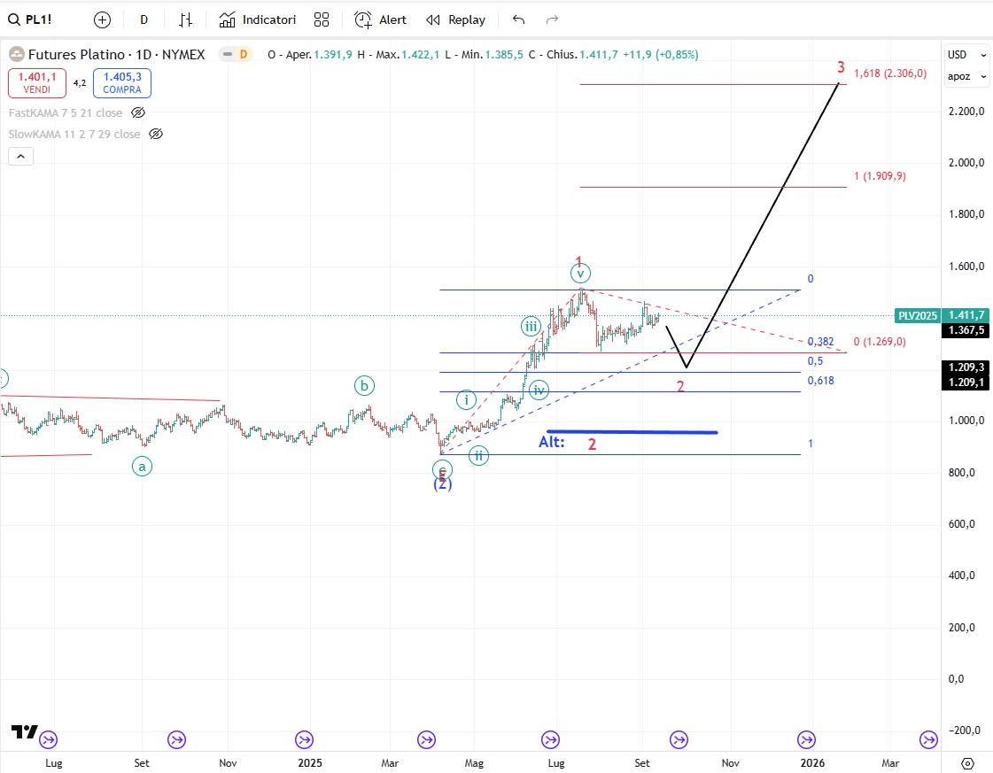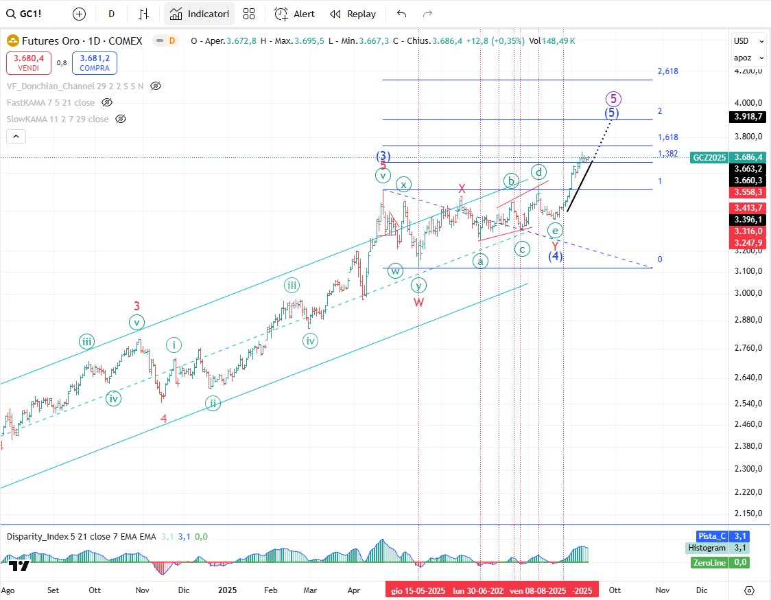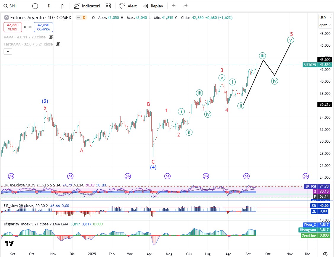 I prezzi dell’oro sono saliti a 3.715,2 nella seduta di martedì 9 settembre. Anche se tecnicamente l’onda (5) potrebbe già considerarsi conclusa con quel massimo, che ha anche superato uno dei due target canonici per le onde quinte nei confronti delle rispettive quarte, non mi stupirei se considerando la forza che sta permeando l’intero comparto dei preziosi l’oro tirasse al target successivo che è rappresentato dal 200% di onda (4). In questo caso l’oro toccherebbe i 3.900$/onz anche in considerazione del fatto che il consolidamento laterale di quattro mesi può fare da “trampolino” verso questo ulteriore target. Quindi in soldoni, l’oro potrebbe aver terminato l’onda (5), ma vi sono diversi motivi che fanno ritenere che esista un maggiore potenziale rialzista. Se l’onda (5) è conclusa i prezzi inizieranno a scendere con un primo target in area 2.860-2.870$.