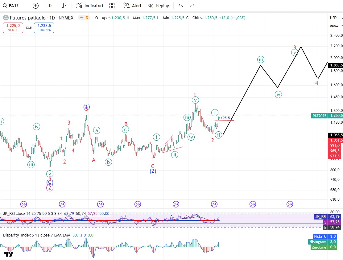 Sul palladio l’onda 2 dovrebbe essere terminata ed ora l’onda 3 dovrebbe dispiegarsi verso l’alto.