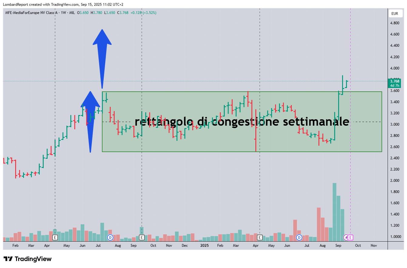 MFE: Media For Europe NV Class A: mi raccomando comprate classe A perchè c’è una differenza tra classe A e Classe B. L’azienda è controllata dalla Fininvest e non ha bisogno di presentazioni. Segnaliamo il pattern tecnico che è la rottura di un box sul settimanale e quindi particolarmente potente. Dopo una prima gamba di rialzo dovremmo vedere la seconda e forse la terza e quindi conviene entrare ora MERCATO, stop loss 3.50, target 4,50 alla proiezione dell’altezza del rettangolo dal punto di rottura attuale: