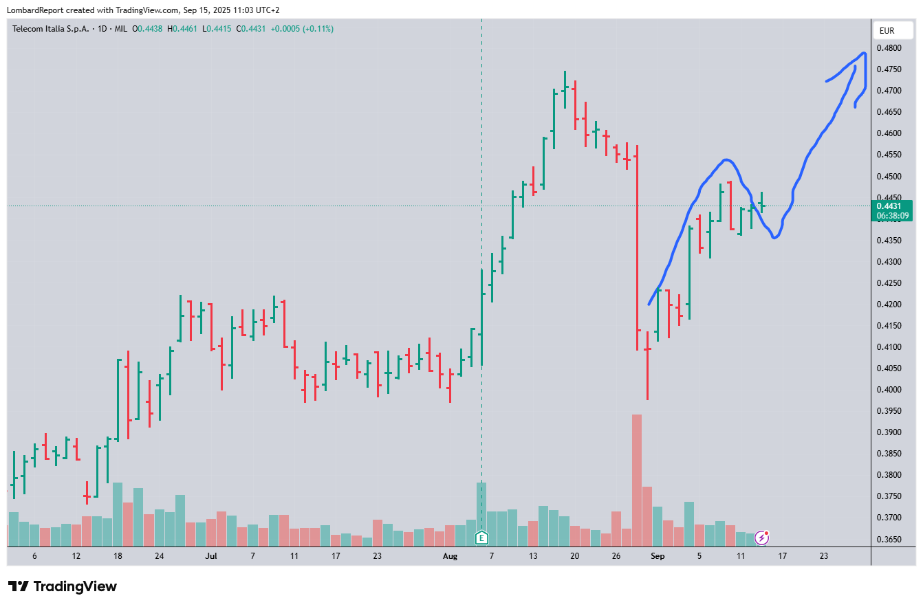 TELECOM: uncino rialzista, compriamo 0.4487 stop, target 0.51, stop loss 0.43