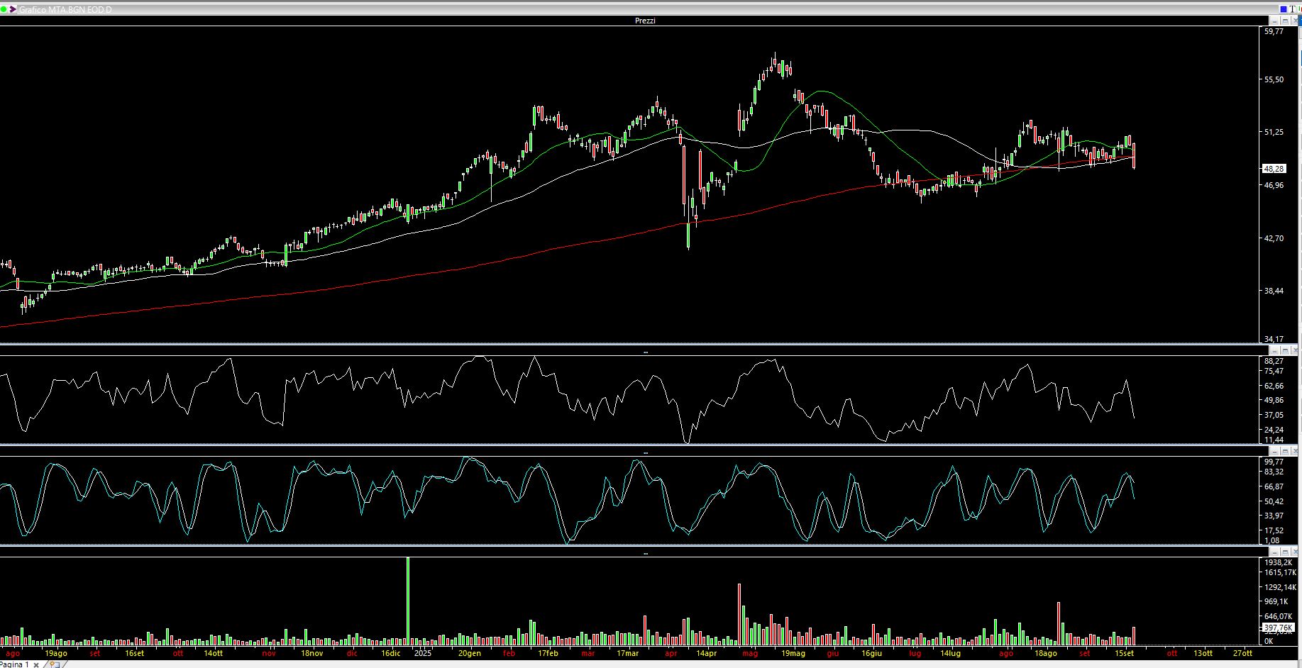 Sul chart daily ha cercato di tornare sopra 50,50 ma poi già ieri ha malamente invertito e il grafico si è oggettivamente imbruttito. Se doveva colmare un pò di gap con altri titoli del settore, ecco che se quei titoli si indeboliscono, il gap si colma in modo opposto.