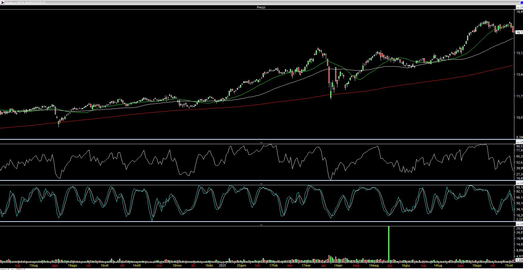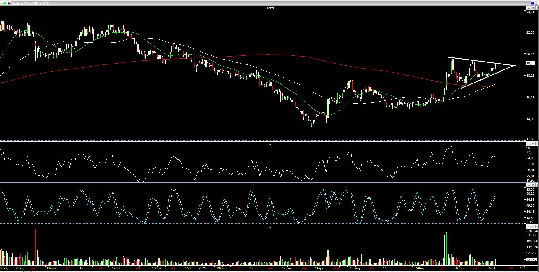 Grafico carino: un triangolone. Da capire dove romperà, con che volumi e soprattutto dove chiuderà. Al momento è ben impostata. Da seguire. Azione tendenzialmente poco liquida (oggi ha scambiato 42mila pezzi, circa 800 milioni di euro).