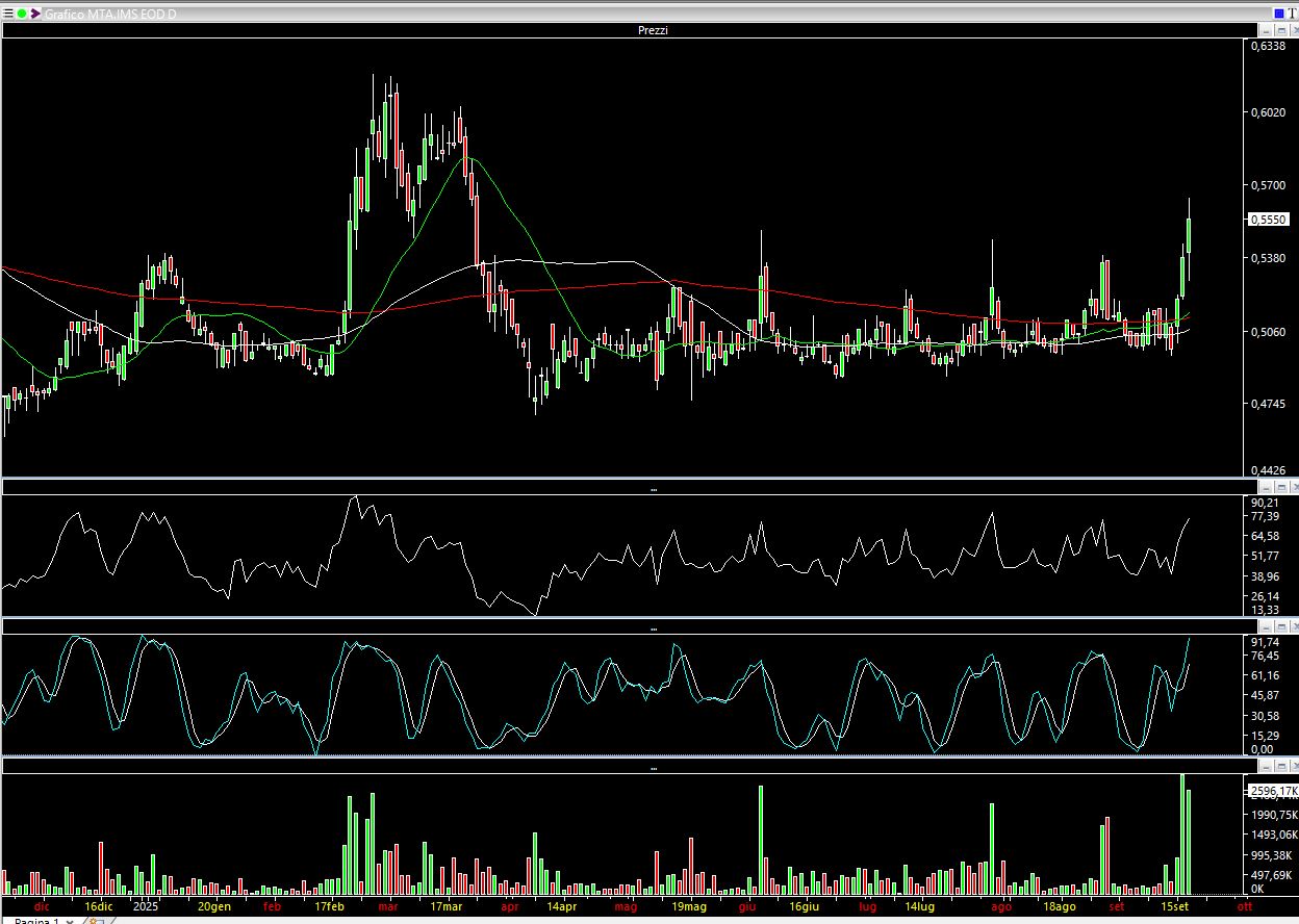 Sabato scorso non ne ho scritto ma dopo la pubblicazione dei dati e un falso movimento al ribasso c'è stata una inversione decisa del trend accompagnata da buoni volumi. Tendenzialmente è un titolo ILLIQUIDO, ma il pattern di uscita dalla congestione non mi dispiace. View modificata in caso di ritorno sotto 0.48 euro rispetto a 0.555 euro di chiusura odierna. Se notate sul grafico daily recentemente ci sono stati diversi spike al rialzo subito rientrati. E' importante che le prossime due sedute non vedano un rientro così repentino.