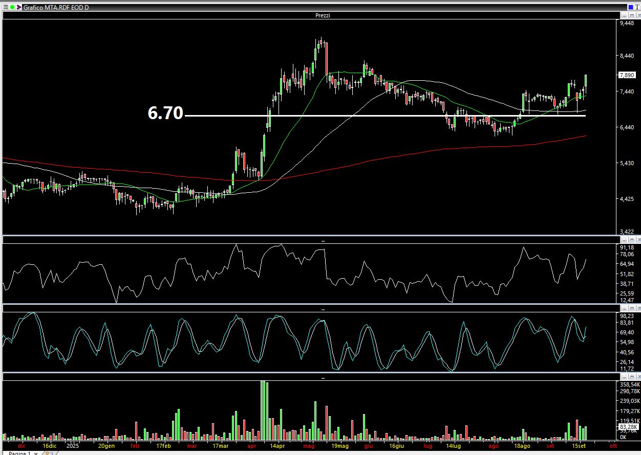 Altra azione poco liquida sulla quale tuttavia nelle ultime sedute abbiamo scambi medi attorno agli 80mila pezzi (circa 600mila euro di controvalore). View potenzialmente rialzista invalidata sotto 6,70 euro.