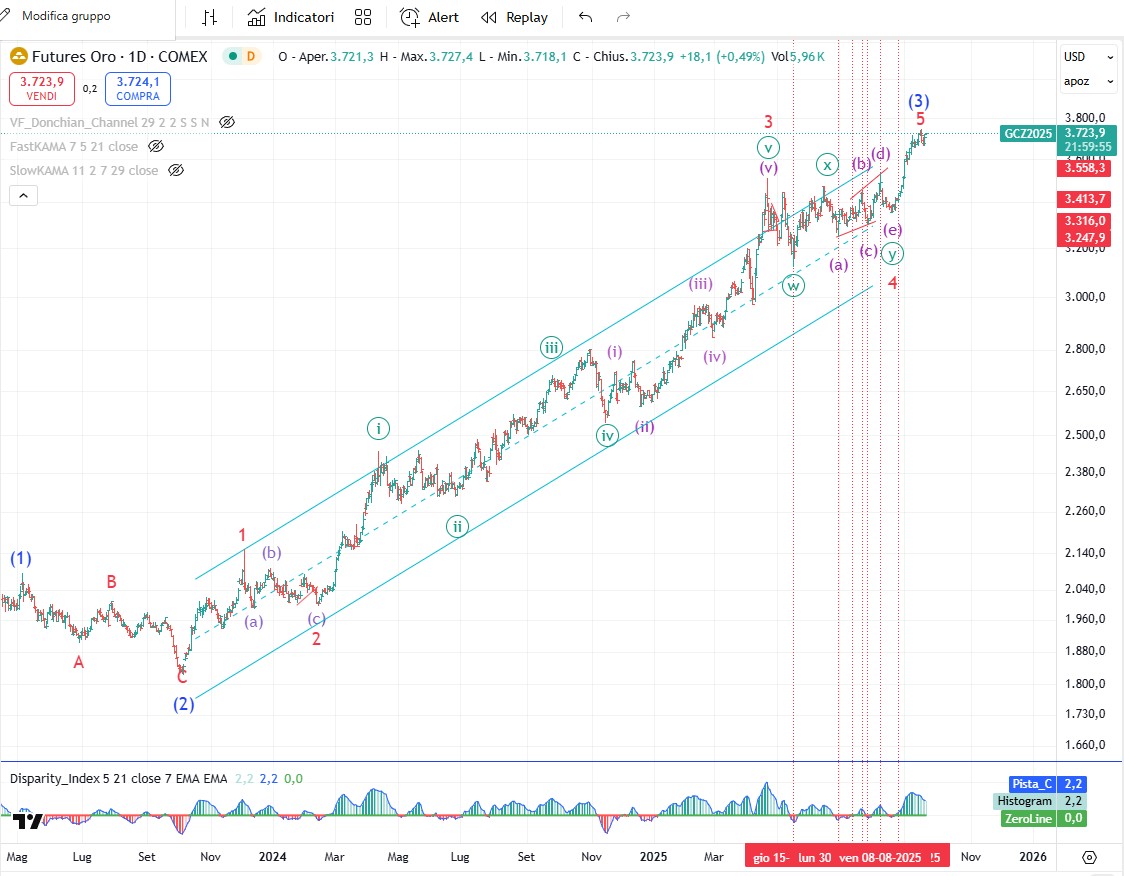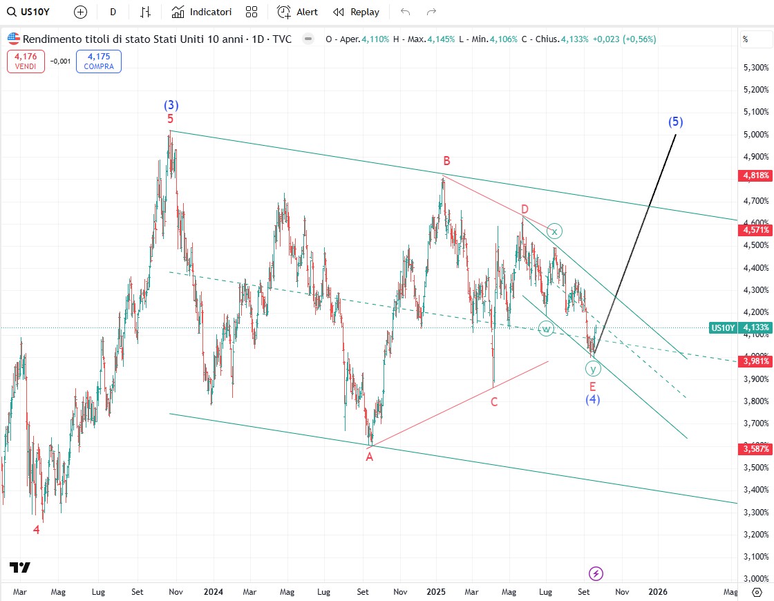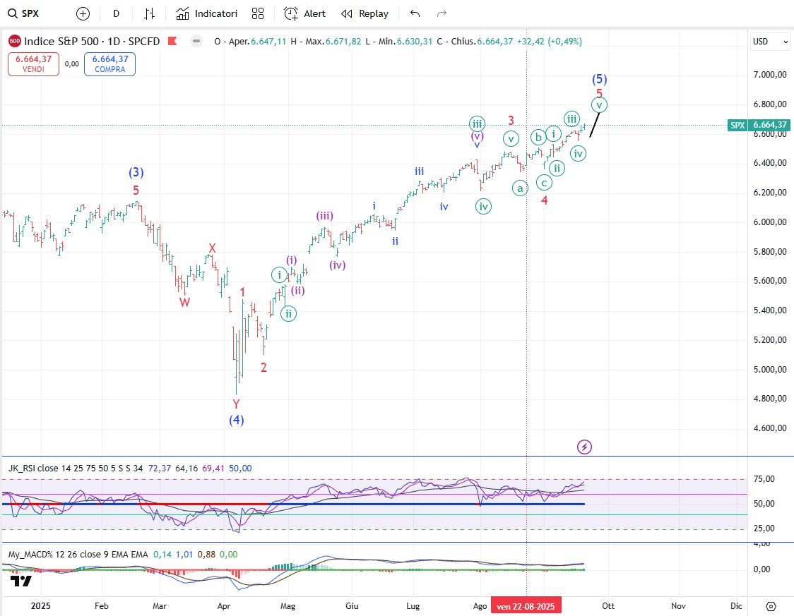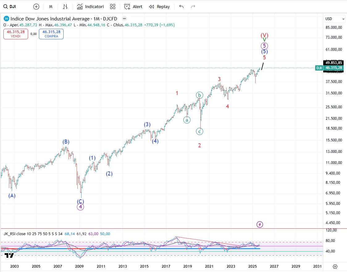 Il Dow Jonesa ha continuato a suddividersi al rialzo, portandosi a 46.396,40 punti intraday nella seduta di venerdì, accompagnato da un rapporto Titoli al rialzo/Titoli al ribasso negativo sul NYSE. Mentre l'indice è avanzato di 172,85 punti (0,37%), per ogni titolo al rialzo due sono andati al ribasso. Dal 22 Agosto ad oggi il rally sembra aver formato un ending diagonal, un struttura compatibile con le quinte onde, ma se i prezzi continuano a salire verso nuovi massimi il pattern sarà negato e avremo l’indicazione che il conteggio attuale è sbagliato.