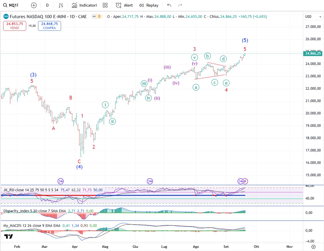 Il NASDAQ 100 sta tracciando l'onda minore 5 dell'onda intermedia (5).Il pattern ha già le carte in regola per potersi considerare concluso, ma nulla impedisce che possa salire ancora. Solo una chiusura al di sotto del minimo della quarta onda a 23.999,75 ci fornirà un segnale iniziale dell'inizio di una svendita più ampia.