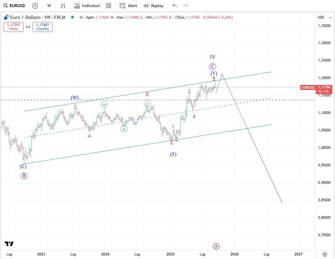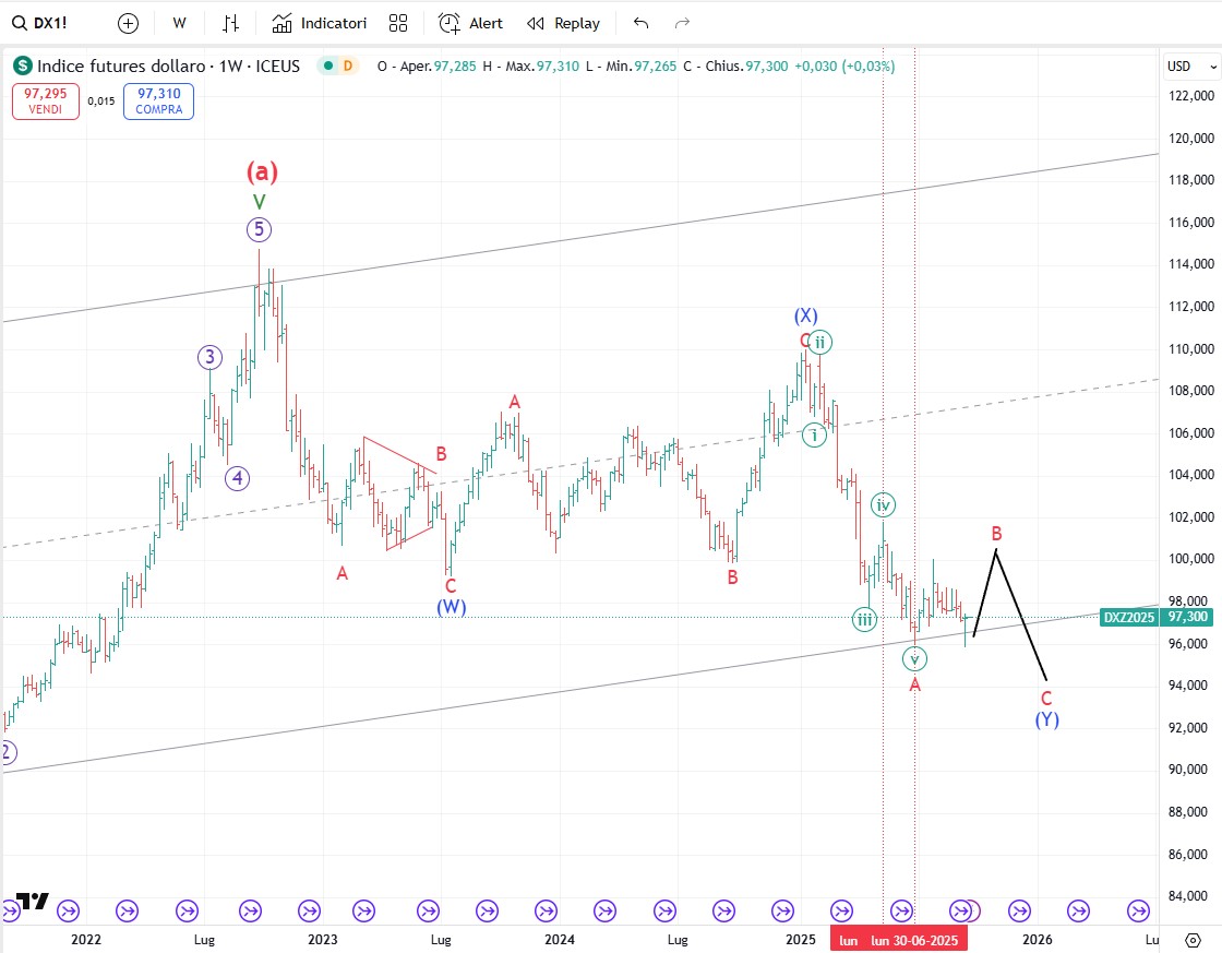 Il pattern del Dollar Index sta diventando più chiaro. L'indice sta tracciando un doppio zigzag dal minimo a 114,778 del 28 settembre 2022. Il secondo zigzag, che sarà suddiviso come ABC, è iniziato a 110,176, il massimo del 13 gennaio 2025. L’onda A di questo secondo zigzag è terminata mentre l’onda B è ancora in corso e dovrebbe riportare il dollaro attorno a quota 100 e la successiva onda C dovrà riportare il dollaro sotto quota 100 (diciamo attorno a quota 95 o giù di lì.
