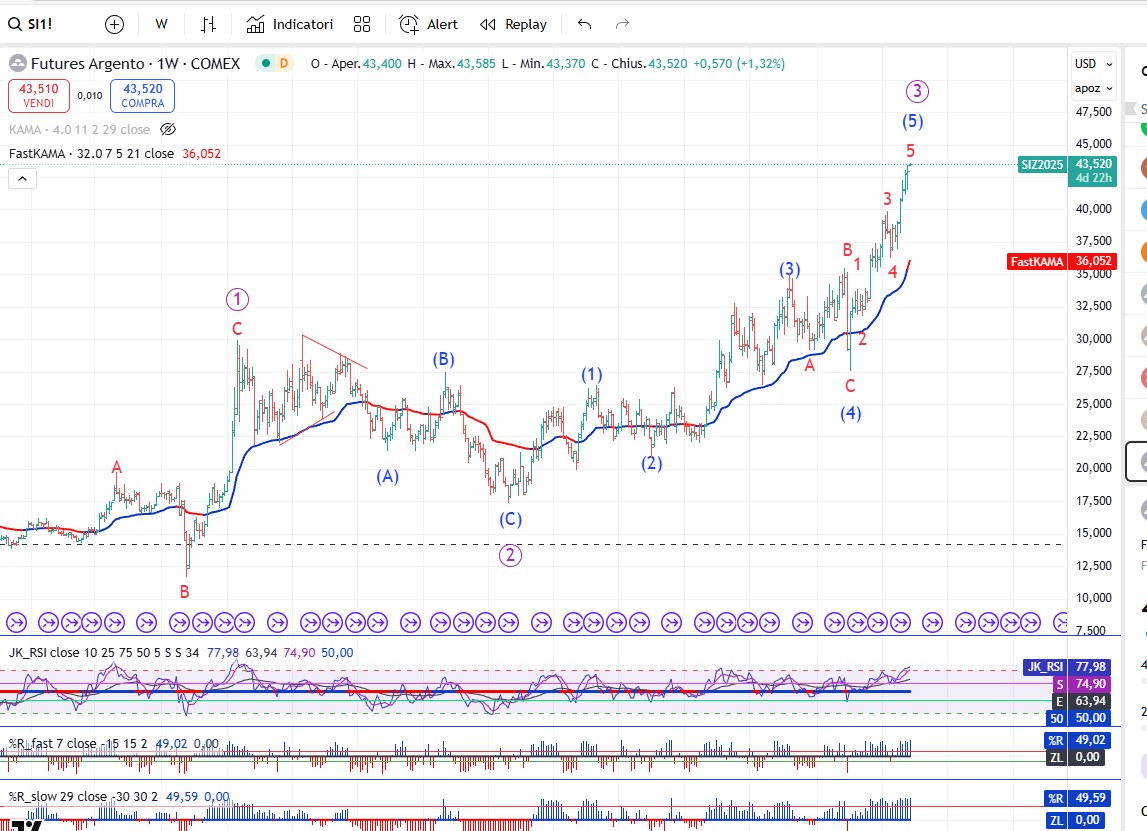 Un forte rialzo di due giorni dell'argento ha portato i prezzi spot a 43,08 dollari, un nuovo massimo per il movimento. Ciò significa che il massimo di martedì di 42,97 dollari è stato il picco dell'onda 3 di (5) e il calo a 41,13 dollari, il minimo del 17 settembre è stato l'onda 4 di (5). L'attuale rally è l'onda 5 di (5). I prezzi potrebbero salire ancora un po' portando l’argento attorno ai 43,5-43,6$.