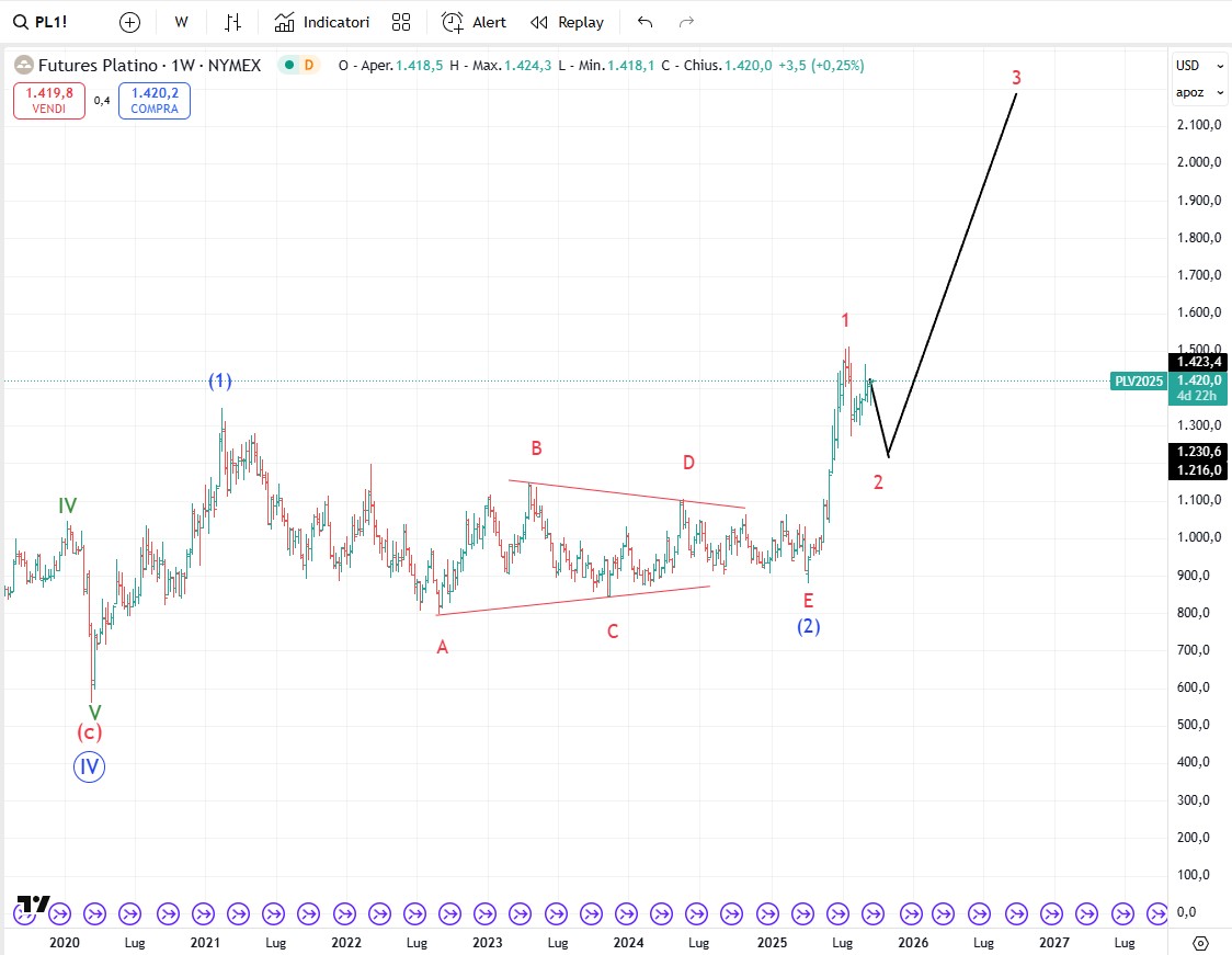 Il platino dovrebbe fare un’altra gambetta di ribasso per terminare l’onda 2 correttiva. Dopo l’onda 3 dovrebbe spingere a sovraperformare oro e argento per recuperare se non tutto almeno in parte i rialzi messi a segno da quest’ultimi.