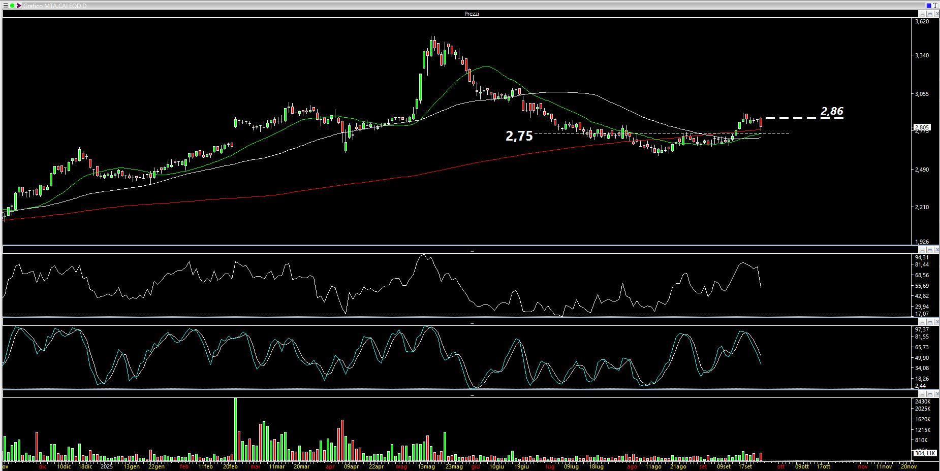 Un titolo che guardo da diverse sedute. Dopo un tentativo di lasciarsi alle spalle l'area del recente breakout a 2,75 è salita a 2,85-2,90 dove ha creato una piccola congestione. Nella seduta odierna quella congestione è stata rotta al ribasso e con volumi: non un bel segnale anche se è stato fatto un pullback proprio attorno ai 2,75. Dovesse risalire verso 2,86 sarebbe un segnale di forza perché la seduta odierna andrebbe considerata come una sorta di caccia agli stop. In caso di ingresso dopo una eventuale risalita collocherei lo stop a 2,75.