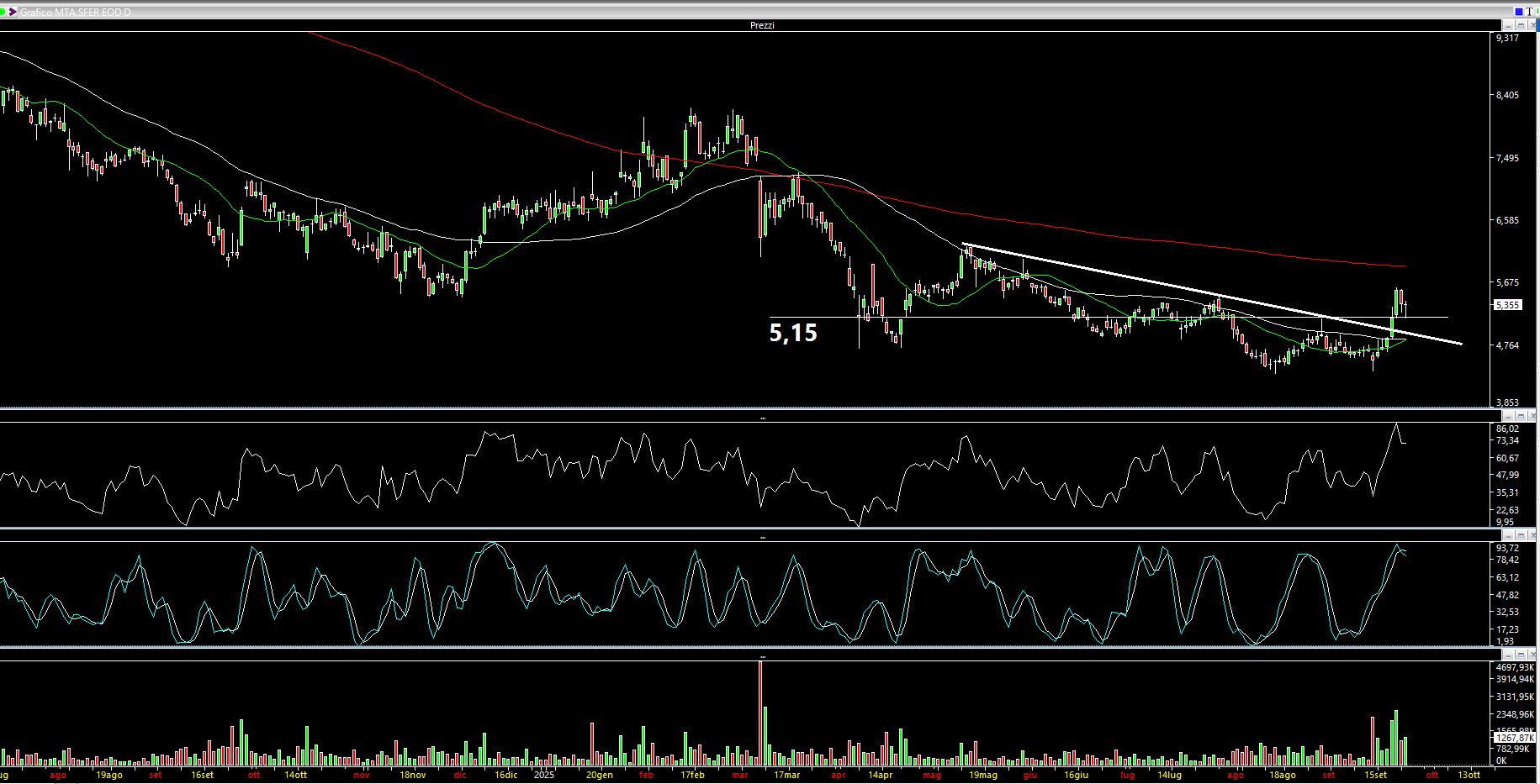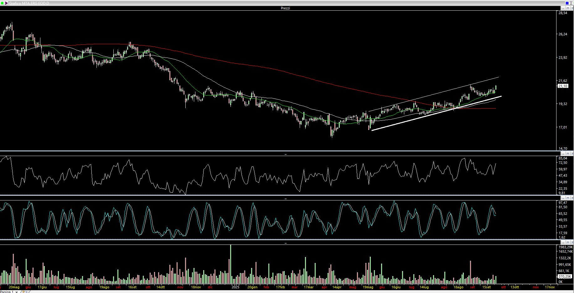 Bel trend sul daily: si sale in modo estremamente lineare senza strappi eclatanti. Le tre medie (20, 50 e 200) si sono incrociate in stile farfallino. Lo stop iniziale in caso di entrata long può essere collocato a 20 euro rispetto ai 21,10 di chiusura odierna. Sopra 21,30 possibile una continuazione verso la parte alta del canale che attualmente transita attorno a 21,70-21,80.