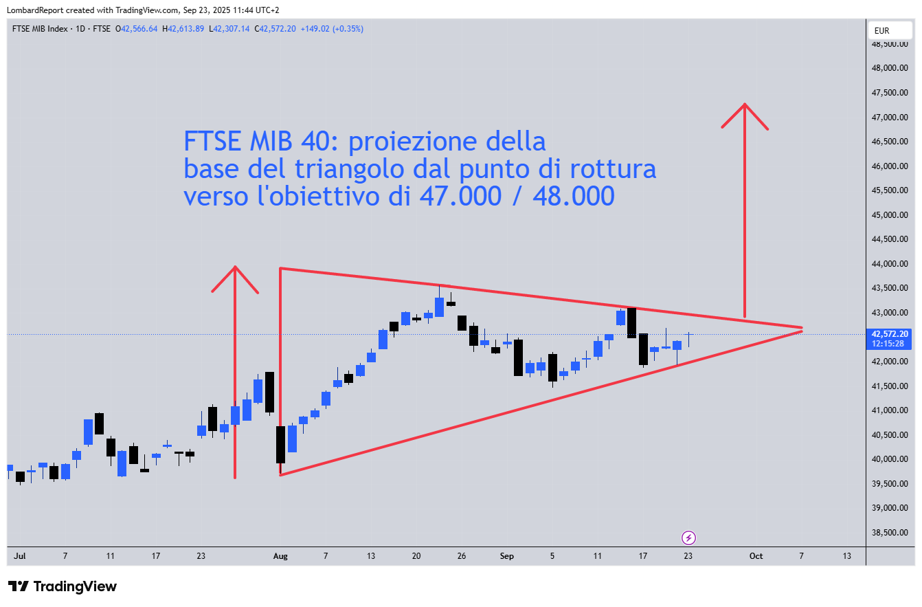 Per quanto riguarda il nostro indice Ftse MIB 40 debbo dire che le cose vanno di bene in meglio. Un mercato che è sui massimi storici come il nostro non gira con una figura tecnica che assomiglia sempre di più a un cuneo / triangolo simmetrico il quale, se rotto, ci proietta a 47.000 e ben oltre quindi il fatidico massimo di 44.000. In maniera molto prosaica verrebbe da dire che siamo in ritardo rispetto al cuneo costruito dagli indici di Wall Street: