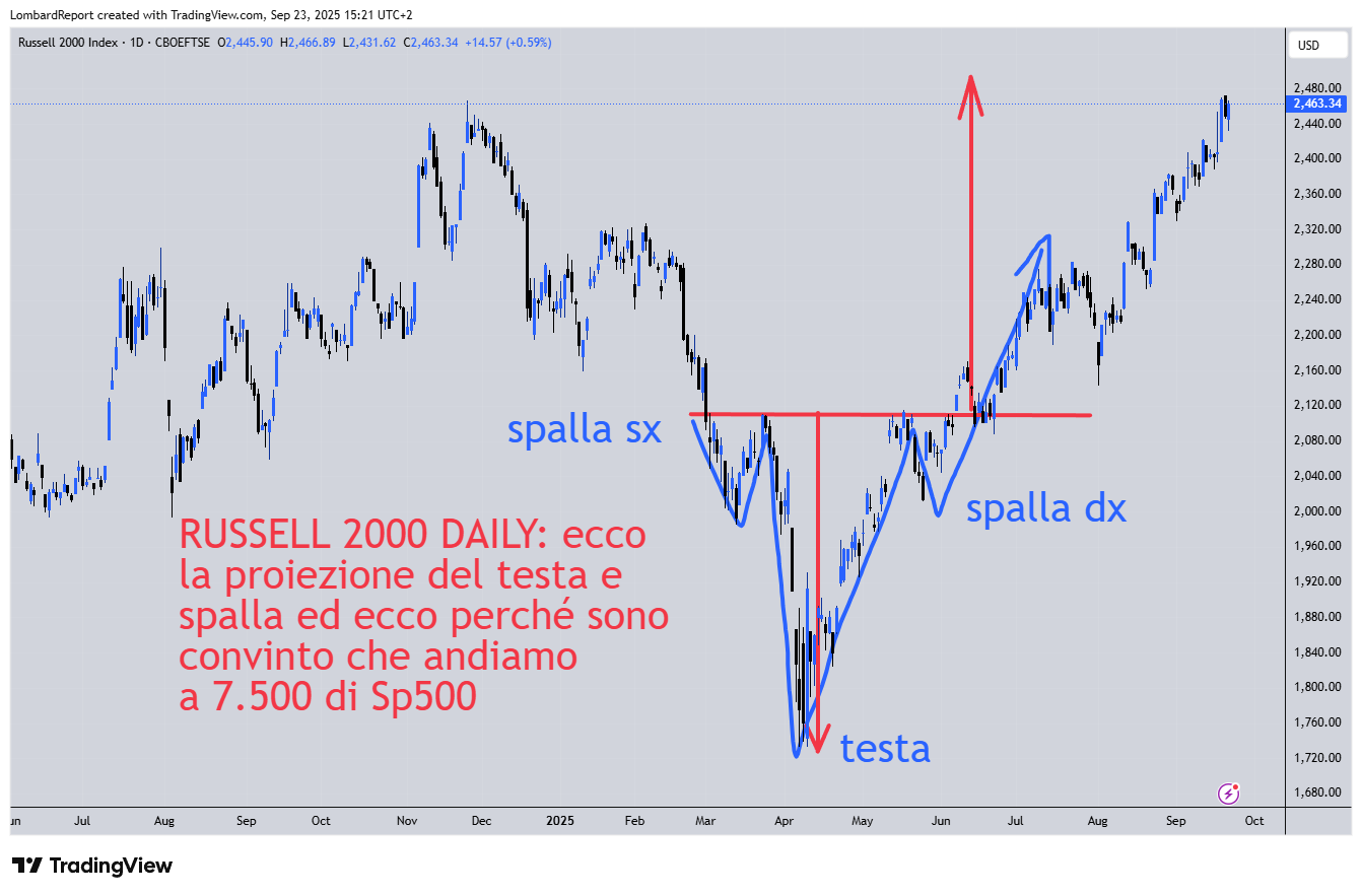 Il Russell 2000 ha raggiunto il nostro obiettivo che avevamo dato in tempi non sospetti: e pubblico lo stesso grafico che abbiamo pubblicato prima dell’estate. Capisco benissimo che dare un obiettivo come questo dopo un pattern di testa e spalla sembra magia e bisogna davvero essere convinti per metterci dei soldi sopra. Oppure (come direbbe un detrattore dell’analisi tecnica) essendo convinti del rialzo qualsiasi pattern andava bene anche quello della gallina morta: