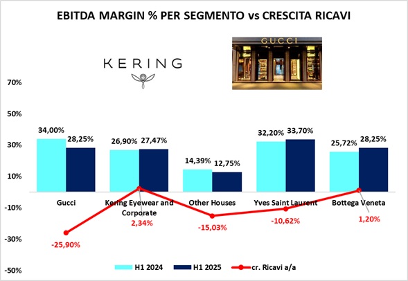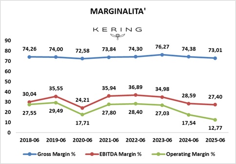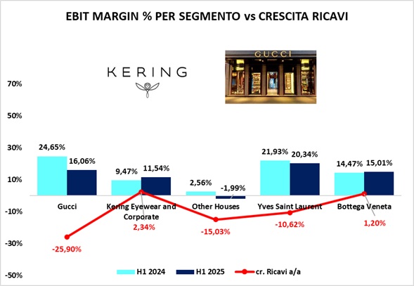 Gucci: margine al 16% (vs 24,7%), la linea in discesa è netta, quasi verticale.