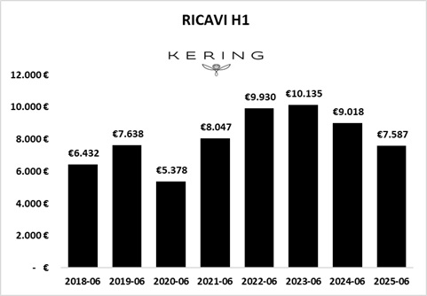 I ricavi del gruppo si attestano a € 7.587 mln, in calo del -16% reported e -15% comparable rispetto all’H1 2024. Il grafico dei ricavi mostra un vero e proprio scalino discendente rispetto all’anno precedente: quasi € 1,5 miliardi di fatturato svaniti in dodici mesi.