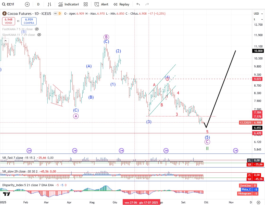Come anticipavo la scorsa settimana il rischio che l’onda (5) non fosse finita esisteva e adesso ne abbiamo avuto la prova. Il ribasso sul cacao non era terminato. Quando sarà conclusa ci aspetta una nuova cavalcata rialzista. Per ora seguiamo l’azione.