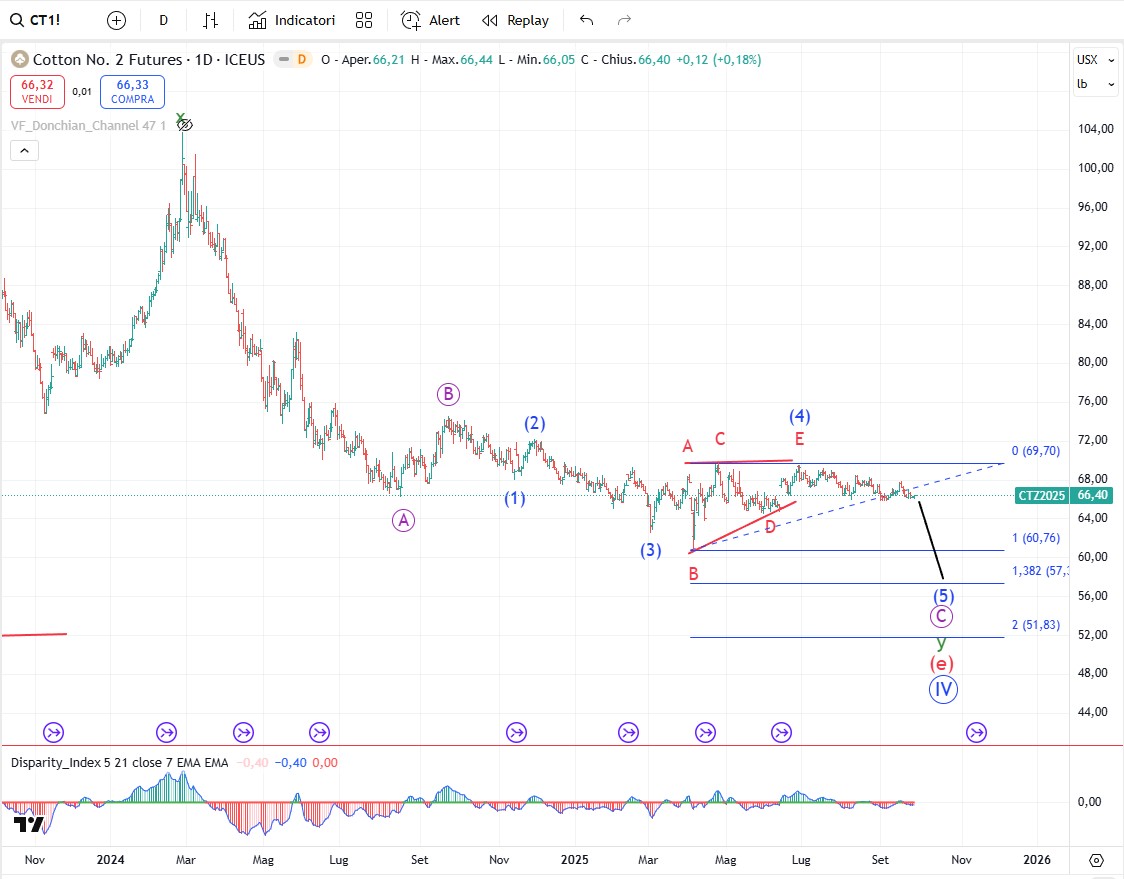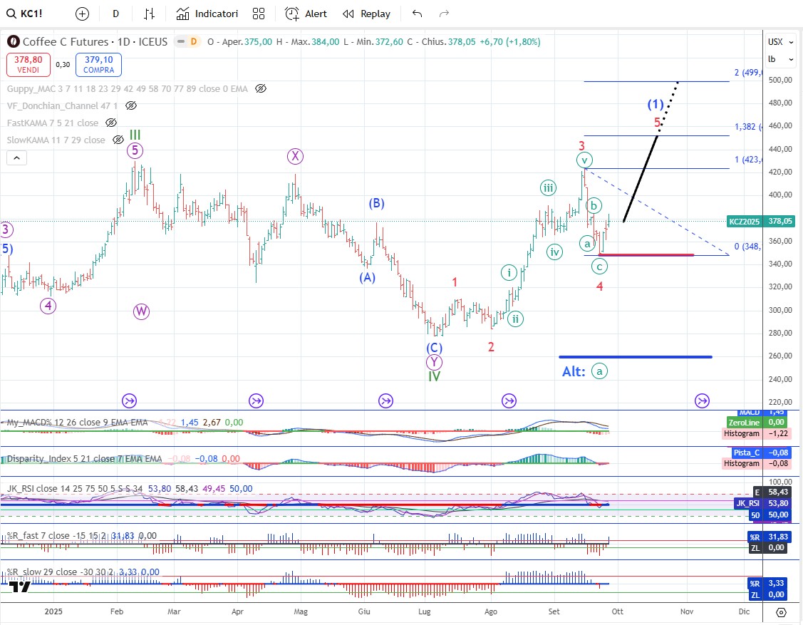 Sul caffè la voglia di rientrare è alta ma non possiamo ancora avere la certezza che l’onda 4 sia conclusa. Dobbiamo aspettare un ritorno dei prezzi verso il minimo di onda 4 e vedere se quel minimo tiene o viene rotto al ribasso. In quest’ultimo caso l’onda 4 terminerà più in basso. Se al contrario il minimo attuale tiene e i prezzi tornano a girare vero l’alto allora è quasi certo che l’onda 5 è attiva.