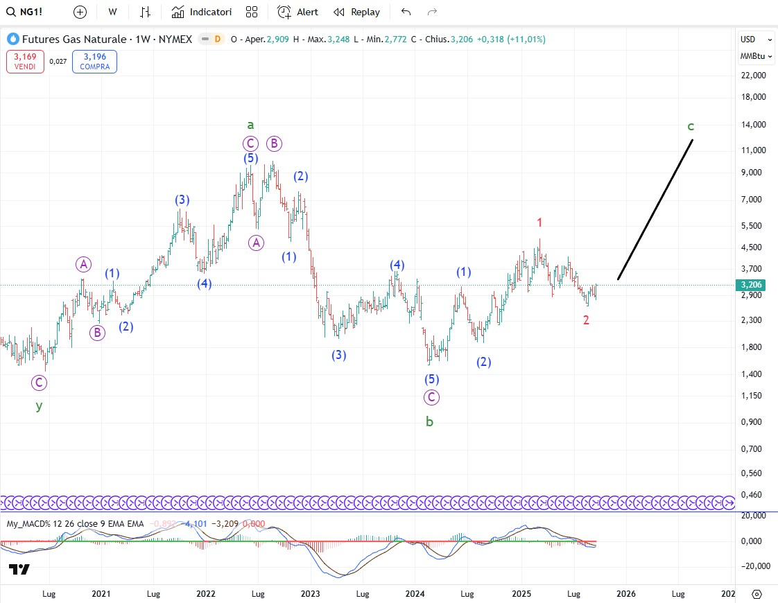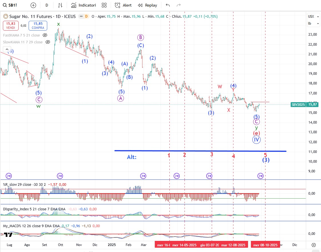 Anche sullo zucchero pur preferendo lo scenario rialzista non possiamo esimerci dal valutare un conteggio alternativo che non nega lo scenario rialzista futuro ma in ogni caso potrebbe posticiparcelo di qualche settimana slittandolo verso fine anno o inizio dell’anno prossimo. Quindi nel grafico sottostante troverete anche evidenziato lo scenario alternativo.
