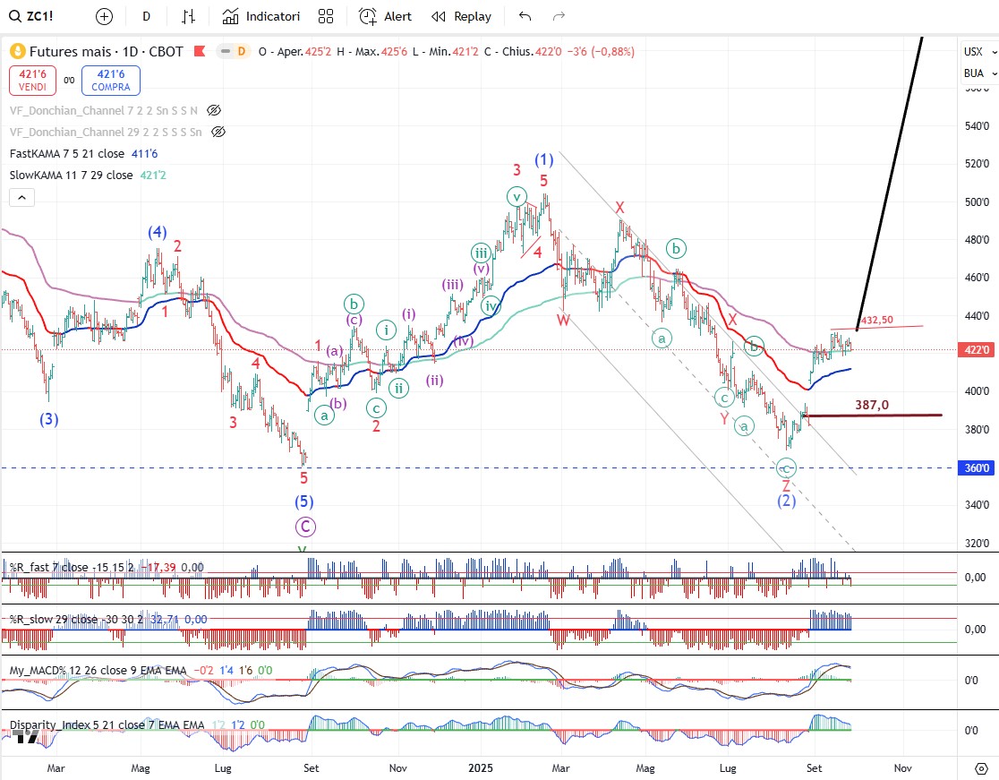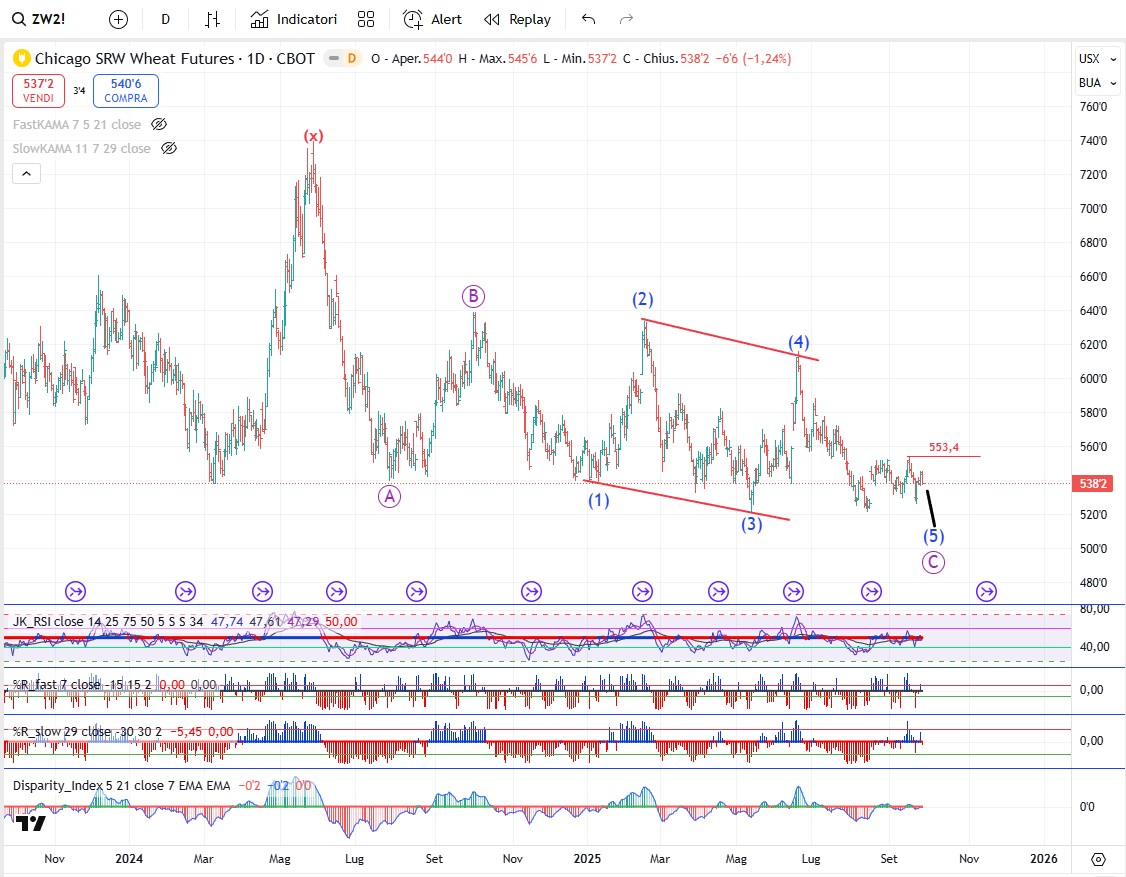 Il grano a differenza del mais e della soia è in ritardo sulla conclusione del ciclo ribassista a cui servono ancora alcune suddivisioni al ribasso per ultimare l’onda (5).