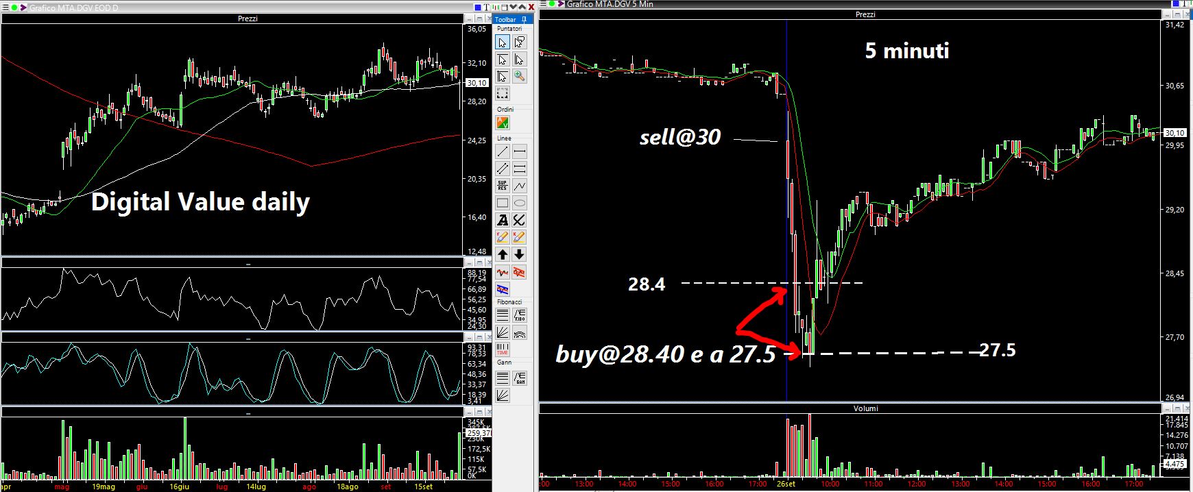Ho menzionato i software, come già fatto tante altre volte. A titolo puramente esemplificativo faccio vedere un trade che ho fatto nella seduta di venerdì sul titolo Digital Value menzionato precedentemente (seppur per altri motivi). Venerdì mattina ha aperto leggermente in ribasso e ho shortato una manciata di azioni a 30 euro. Fin da subito la macchinetta metteva denaro corposo (2500-3000 pezzi) per far salire il quotatore di qualche tick e poi però qualcuno spazzolava al meglio. In questo modo entrano i volumi e i software che operano sulle size vengono in qualche modo attirati da questo flusso. Ecco dunque che in pochi minuti (a dire il vero una ventina) siamo passati da 30 euro a 27,35 euro (-8.8% !!!!). In quel punto il quotatore che vendeva è stato fatto invertire ed il titolo ha poi chiuso la seduta con una sorta di movimento a "V". Personalmente ho venduto appunto una manciata di pezzi a 30 euro, ricoprendone metà a 28,40 (giusto per rispettare un minimo il money management) ed infine a 27,50 la seconda metà. Tre tick dopo la macchinetta ha invertito il flusso e la chiusura di seduta è stata a 30,10 euro. Follia, ma ringraziamo chi permette l'utilizzo di queste macchinette! Alla fine è come far gareggiare una macchina guidata da una sorta di intelligenza artificiale (che include sempre una stupidità perché non si è creata dal nulla ma qualcuno l'ha programmata) ad un gran premio in cui ci sono solo piloti in carne ed ossa.