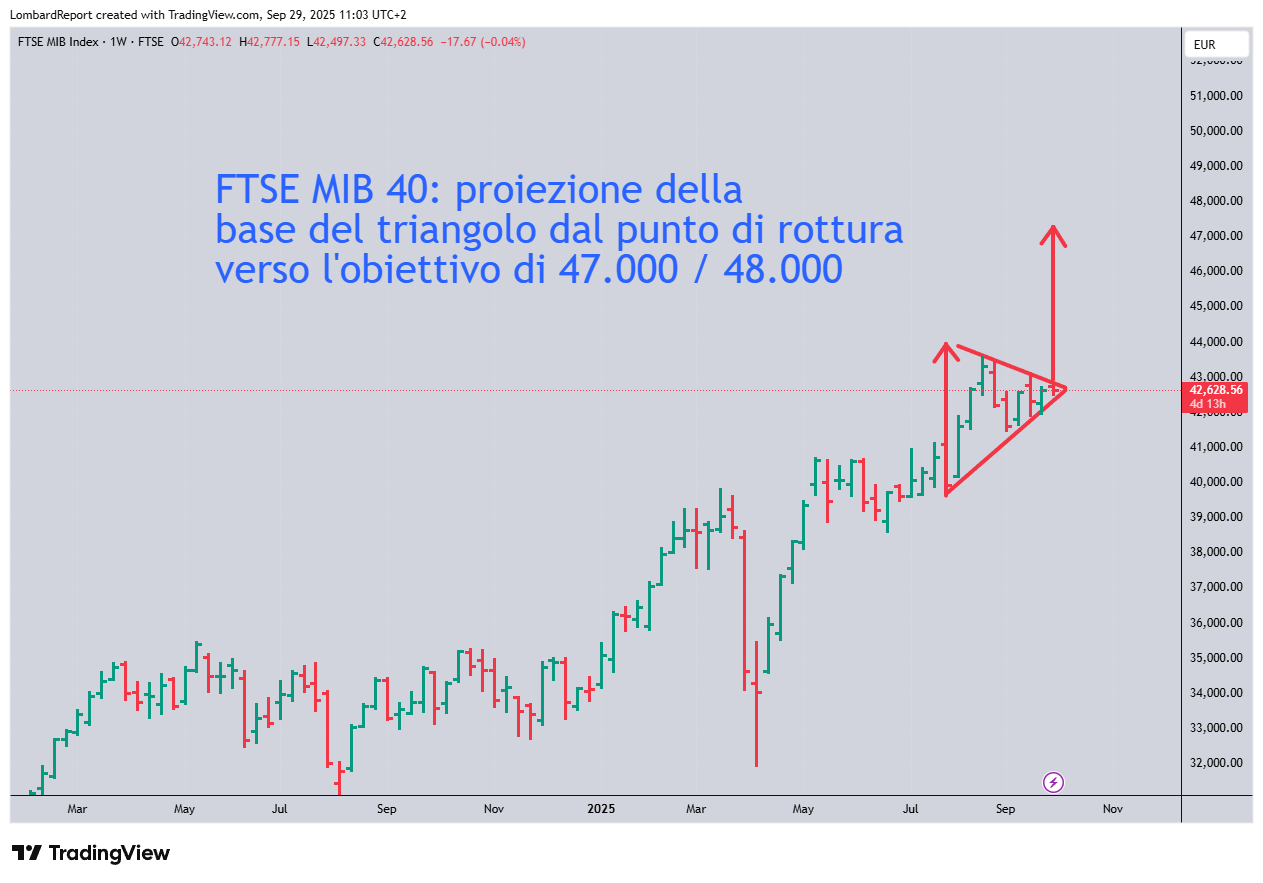 FTSE MIB 40: ci esponiamo al pubblico ludibrio con questo grafico settimanale del Ftse MIB 40 che mostra un gustosissimo triangolo simmetrico. Da che parte sarà rotto ? Al rialzo e andiamo a 48.000 al ribasso e andiamo a cavallo di 38.000 ? E’ evidente che in un trend al rialzo prevedere un ribasso di questa portata è difficile e quindi è meglio fare i furbacchioni e prevedere la rottura al rialzo perché le probabilità sono dalla nostra parte …