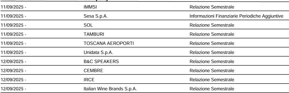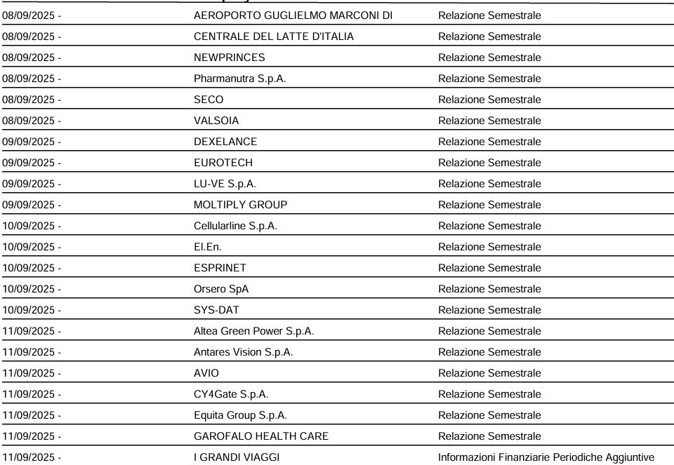Segnalo infine il calendario societario per la settimana entrante, invitando ciascuno a verificare la correttezza delle informazioni fornite (Fonte dati: Borsa Italiana).
