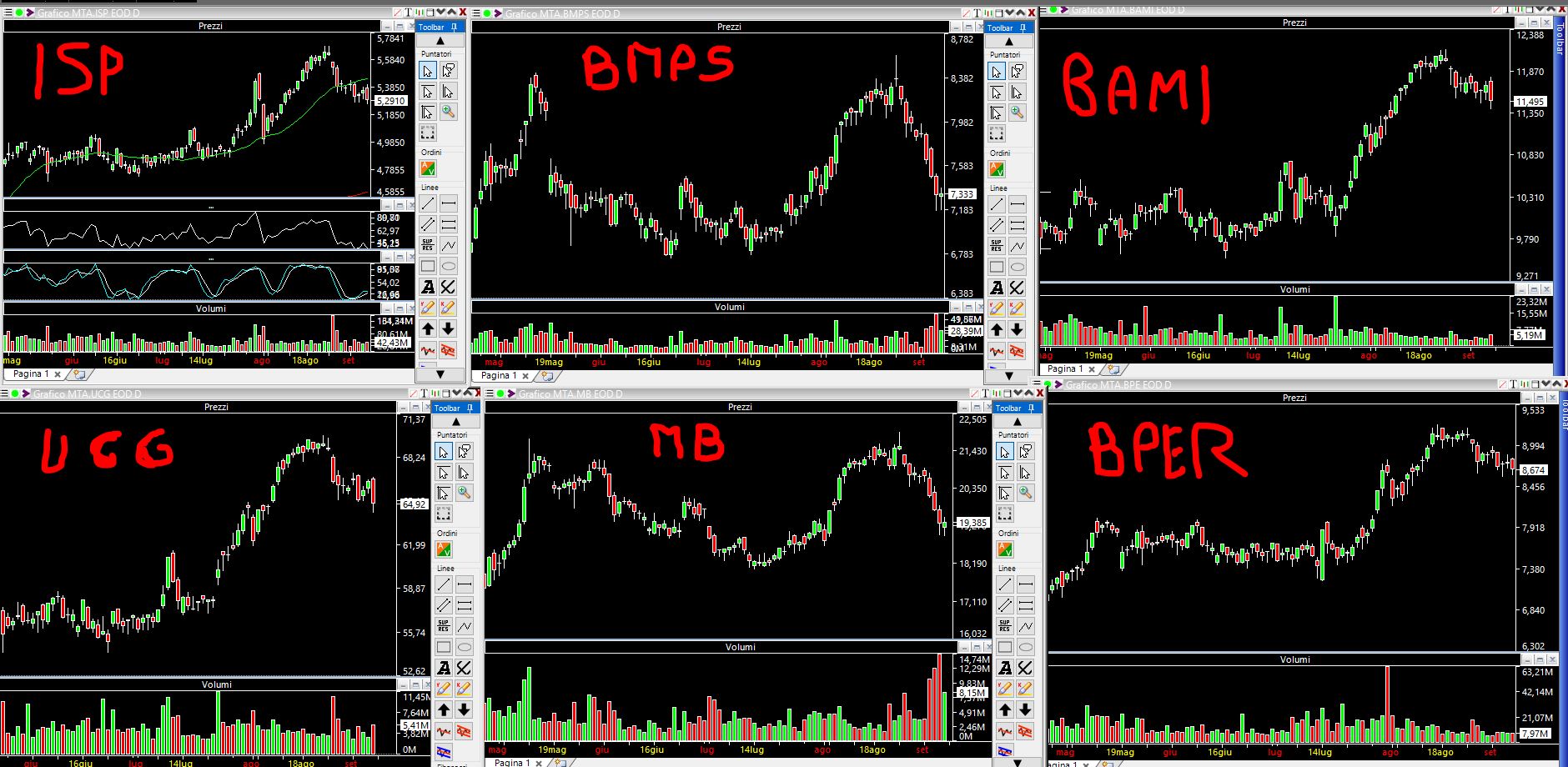 La debolezza in Italia proviene principalmente dal comparto bancario che poi è lo stesso che ha sostenuto la crescita degli ultimi mesi come potete vedere nel grafico successivo in cui ho selezionato alcune azioni core: Intesa, Montepaschi, Bami, Unicredit, Mediobanca e Bper. Se ben ricordate tra tutti questi titoli avevo selezionato Unicredit "pinzata" molto bene sul nascere dell'ultima gamba rialzista, poi è entrato il trailing stop in area 67,50 euro (vado a memoria). Come potremo notare anche da Eni che analizzerò in seguito, la difficoltà principale di questo mercato è che magari le azioni salgono a più non posso e poi arriva lo storno improvviso che rischia di precludere tutto il gain accumulato (Montepaschi e Mediobanca ne sono l'esempio lampante).