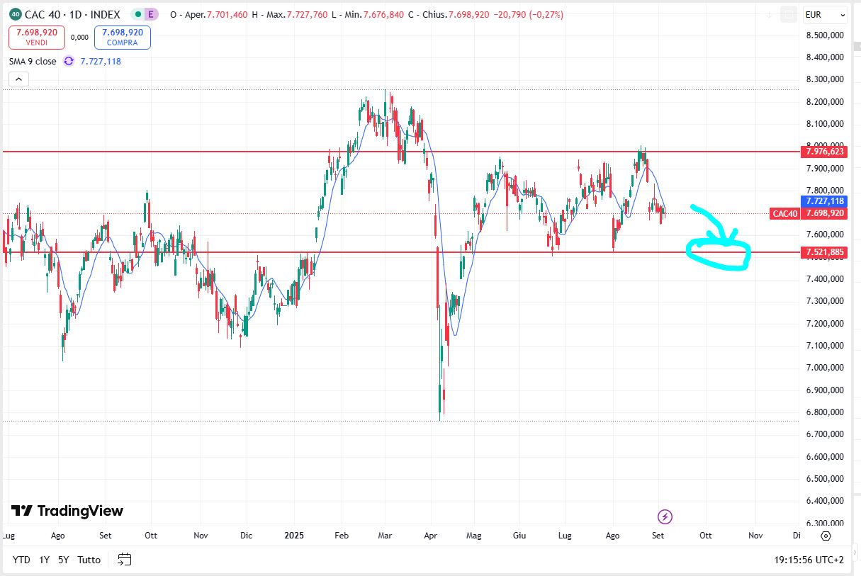 Ha tenuto meglio il CAC40 di Parigi che invece si era mostrato molto debole la scorsa ottava. Lunedì ci sarà il voto di fiducia del governo francese e questo potrebbe fornire il pretesto per un test del supportone che si trova decisamente più in basso e che ho cerchiato nel grafico successivo su scala daily passante attorno a 7500 punti...ma se venisse poi bucato? Lo vedremo mano a mano.
