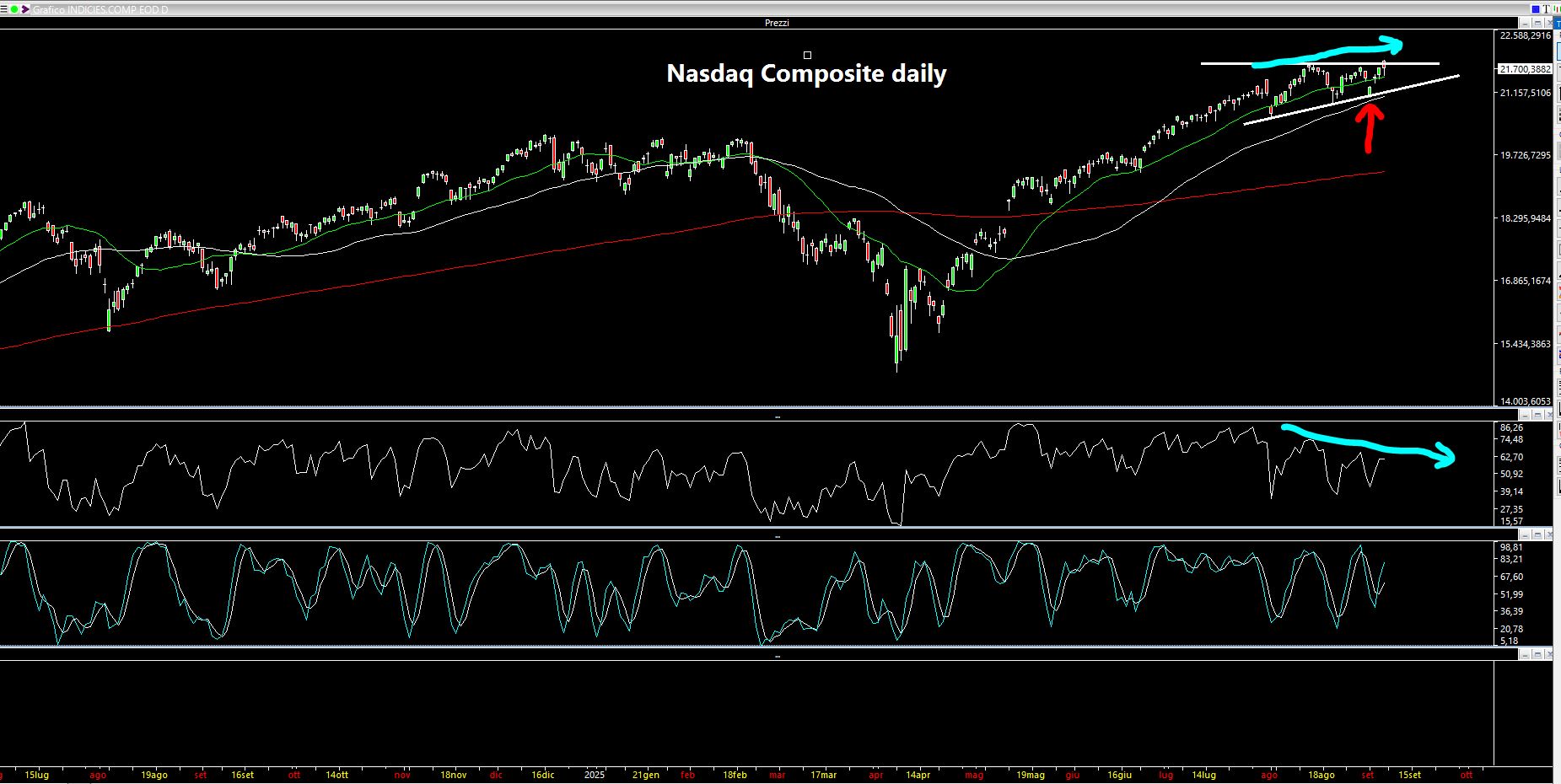 Il Nasdaq Composite ha addirittura ritoccato i massimi storici venerdì con un open in gap up poi richiuso a causa della debolezza di Nvidia e Palantir. Sabato scorso ho parlato di una possibile formazione a triangolo con minimi crescenti e massimi allineati. Il gap up ha ritoccato de facto i massimi ma il close è stato poi a 21700 punti quindi poco sotto la linea statica di resistenza. Rimane comunque sempre una divergenza ribassista tra RSI e indice (frecce blu). Attenzione solo in caso di ritorno sui minimi di settimana (gap down di martedì evidenziato dalla freccia rossa).