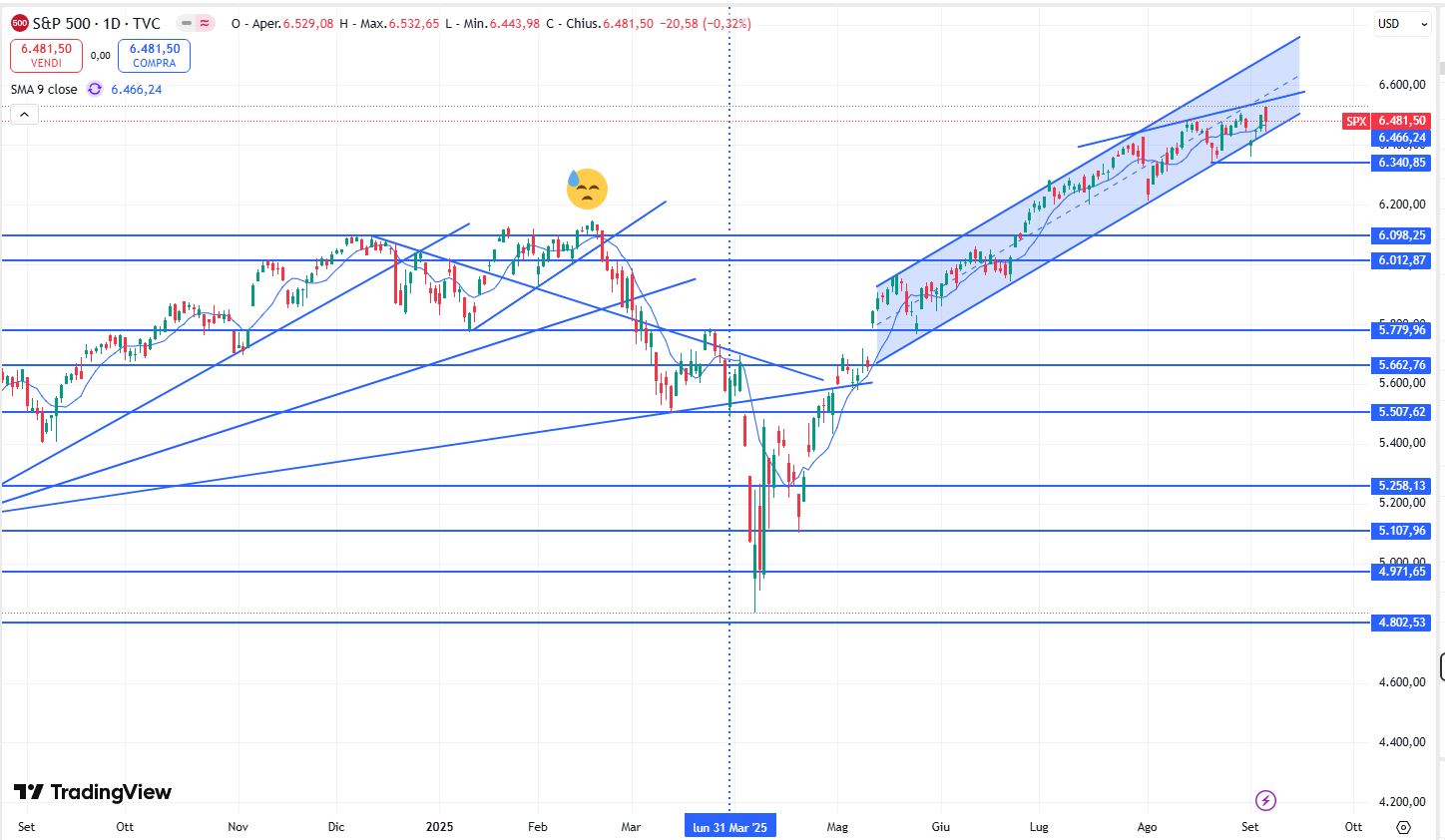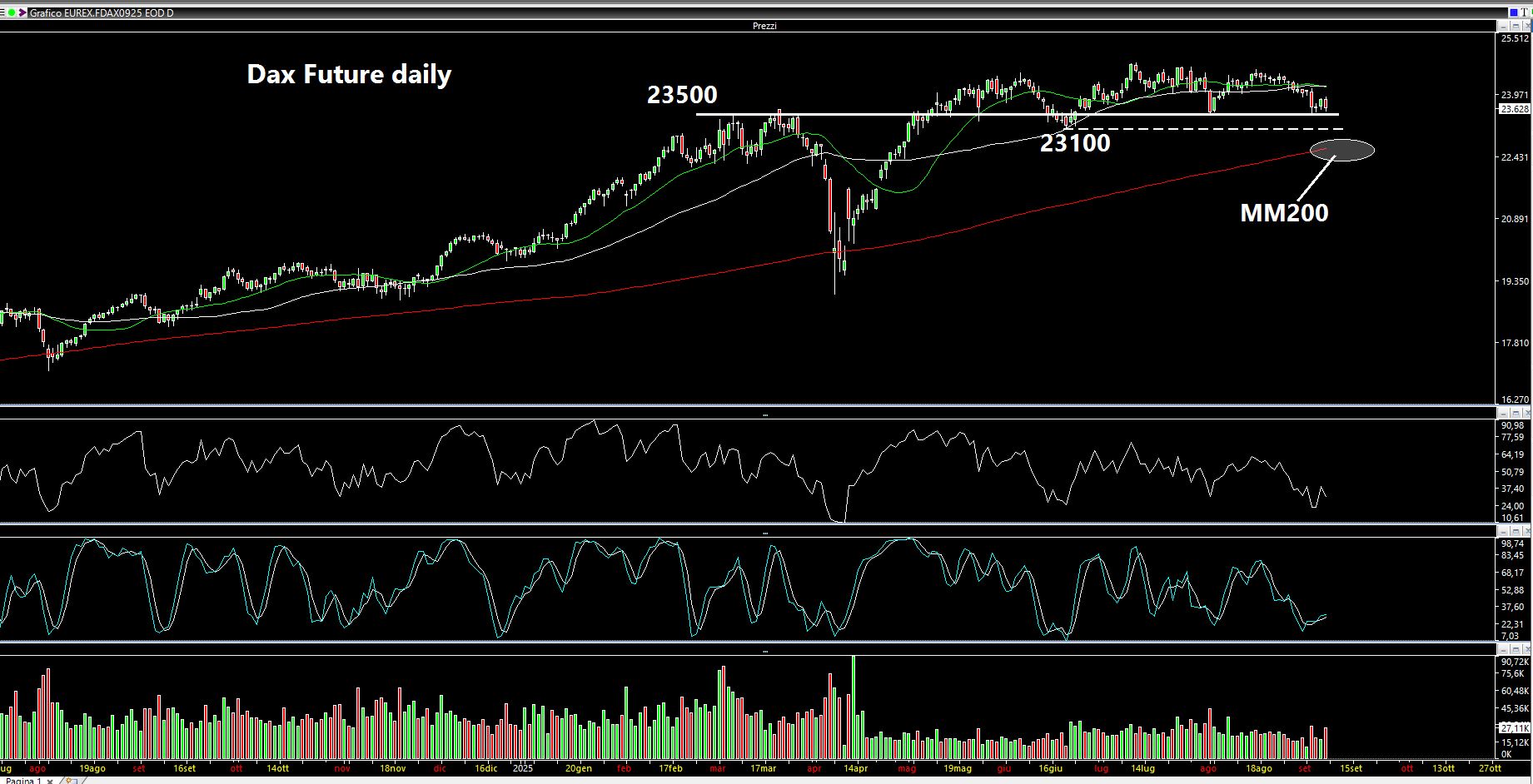 Si è chiusa una settimana piuttosto difficile sui mercati europei, con il Dax che ha guidato il ribasso avvicinandosi al primo supporto individuato sabato scorso attorno a 23500 punti (link articolo: https://www.lombardreport.com/2025/8/30/azioni-eni/). Sotto questo livello troviamo la linea tratteggiata e quindi il supporto successivo a 23100. Certamente c'è la soglia psicologica dei 23mila ma a quel punto la logica, ammesso che esista sui mercati, vorrebbe il test della media mobile a 200 periodi che attualmente passa attorno a 22600.