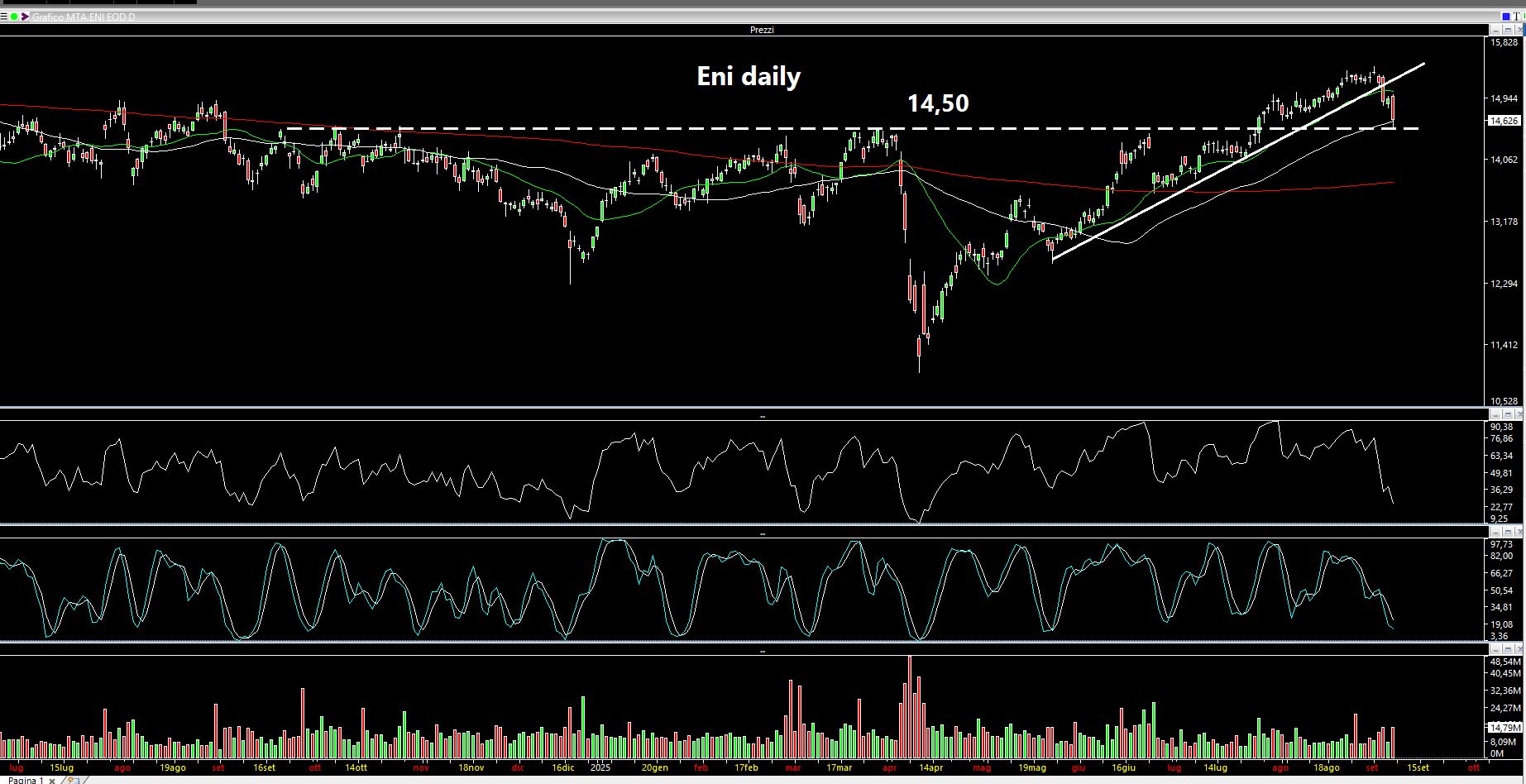Questa settimana ho inviato un update relativamente ad un trailing stop su Eni e ad uno stop loss di pochissimi punti percentuali su Banca Generali (link articolo: https://www.lombardreport.com/2025/9/3/azioni-eni-azioni-banca-generali/). Questo è un ulteriore spunto di riflessione per farvi notare come il rally di Eni che abbiamo cavalcato fino al trailing profit, estremamente lineare e costante, sarebbe quasi svanito del tutto se lo stop non fosse stato rispettato. E parliamo di Eni che è un pachiderma, ma è passata da 15,39 euro a 14,626 al close di venerdì e quindi rispetto ai massimi in tre o quattro sedute ha perso quasi il 5% !!!! Sarebbe stato frustrante rimangiarsi tutto l'utile. E' interessante far notare come il titolo si sia appoggiato millimetricamente a quella resistenza che aveva poi fornito la trigger/conferma di breakout. C'è un però: vi fidereste a comprare alla garibaldina dopo una rottura di trendline dinamica ascendente con volumi in leggero aumento e prezzo dell'oil in indebolimento? Naturalmente dipende dall'approccio al rischio di ciascuno, ma al momento io evito di farlo.