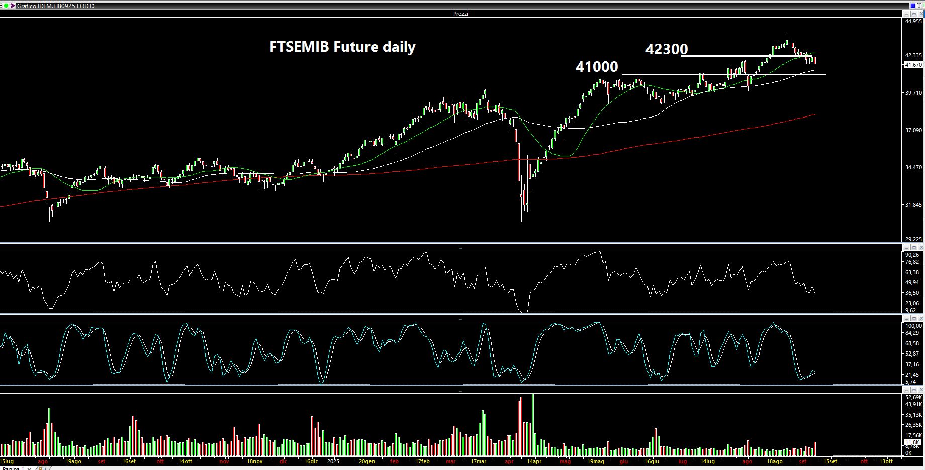 Il nostro Future invece ha rotto i 42300 punti individuati la scorsa settimana e si sta dirigendo verso i 41000, appesantito dal comparto bancario ma non solo dal momento che il ribasso dell'oil ha causato un ribasso anche dei petroliferi (Eni).