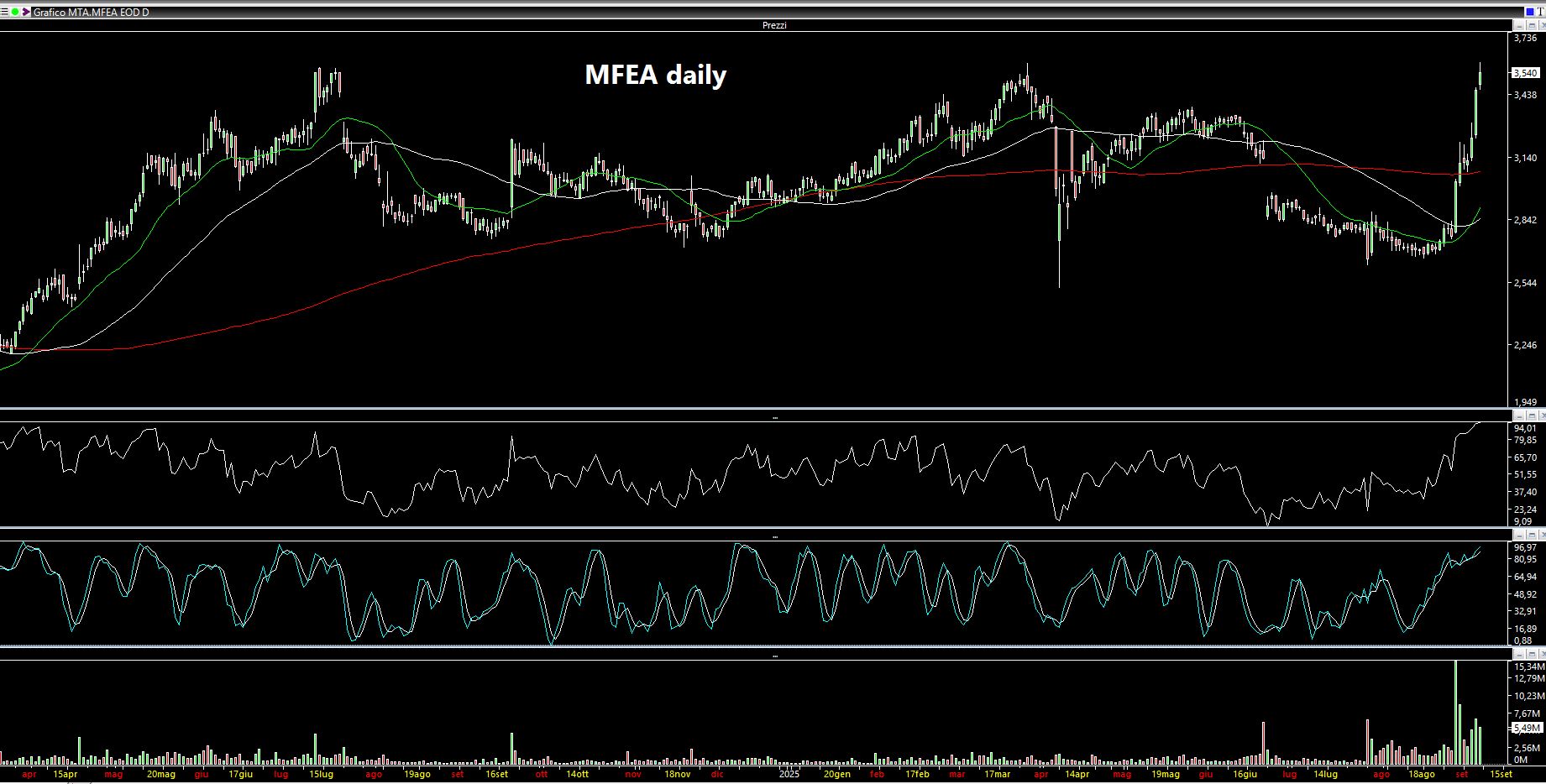 Questo approccio rischia di far perdere delle possibili occasioni -che magari qualcuno ha colto- su azioni ben impostate. Sabato scorso nella watchlist ho inserito Mediaset (link: https://www.lombardreport.com/2025/8/30/azioni-eni/). Pardon, MFEA: sono rimasto un pò all'antica. Dopo un piccolo consolidamento di un paio di giorni che però non ho colto, il titolo è schizzato nuovamente verso l'alto passando da 3,10 euro a 3,58 che facendo i conti della serva è +15%. Il tutto in TRE sedute.