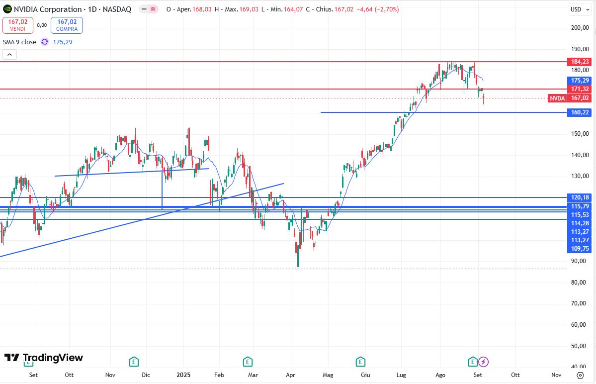 Un titolo che ho inserito nella mia watchlist come driver dei mercati americani è Nvidia che aveva creato un box compreso tra 171 dollari e 184$. La rottura confermata dei 171 potrebbe portare al test dell'area collocata a 160 circa o poco sotto.