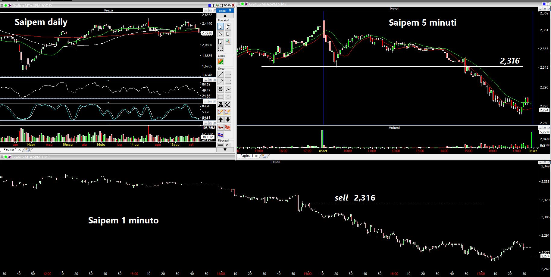 Ho citato l'andamento debole del petrolio specialmente nell'ultima seduta di settimana. A titolo puramente esemplificativo ecco un piccolo trade che ho fatto venerdì pomeriggio quando mi sono accorto proprio della debolezza del derivato sull'OIL. Saipem, azione tendenzialmente in laterale sul daily (a ridosso della media a 20 e della media a 50 periodi), su un grafico a 5 minuti nel primo pomeriggio presentava massimi tendenzialmente decrescenti e un paio di minimi allineati in area 2,316 euro. Ho aspettato il breakout del livello, ma consapevole della manipolazione di mercato dei software da arbitraggio e dei quotatori che scavallano le proposte nei book (sempre primo denaro o prima lettera, distorcendo il book stesso una volta che vengono colpiti da un lato piuttosto che dall'altro), ho aspettato appunto che la lettera in un movimento ribassista in fieri venisse colpita, magari per uno short covering, e così ho inserito un ordine di vendita di 6000 Saipem al prezzo di 2,316 euro alle ore 14:53:33. Tale ordine è stato fillato poco più di due minuti dopo. In questo caso lo stop poteva essere a tempo (chiusura di seduta) oppure in area 2,34-2,35 euro. I software, come ho già avuto modo di dire, tendenzialmente non manifestano una reale volontà di acquisto/vendita, ma immettono e revocano proposte di negoziazione in modo continuo distorcendo de facto la realtà delle proposte visibili. Quando vengono colpiti attirano altri algoritmi che operano sui volumi che in qualche modo "ribaltano" i precedenti quotatori. Dovrebbero essere vietati a mio avviso, ma se non lo sono vanno sfruttati. Tornando all'esempio, un paio di minuti dopo l'inserimento del mio ordine vengo eseguito e mantengo dunque questa posizione short decidendo si smezzarla alle ore 17:09:49 minuti e vengo eseguito quattro secondi dopo alle ore 17:09:53 un tick sopra il minimo di seduta a 2.271 euro (il minimo di giornata è stato a 2.270 euro): i software, come già detto in altre occasioni, manipolando i corsi fanno segnare massimi e minimi (assoluti o relativi). Il resto del trade me lo sono "giocato" fino al close che è poi stato a 2.274 euro.