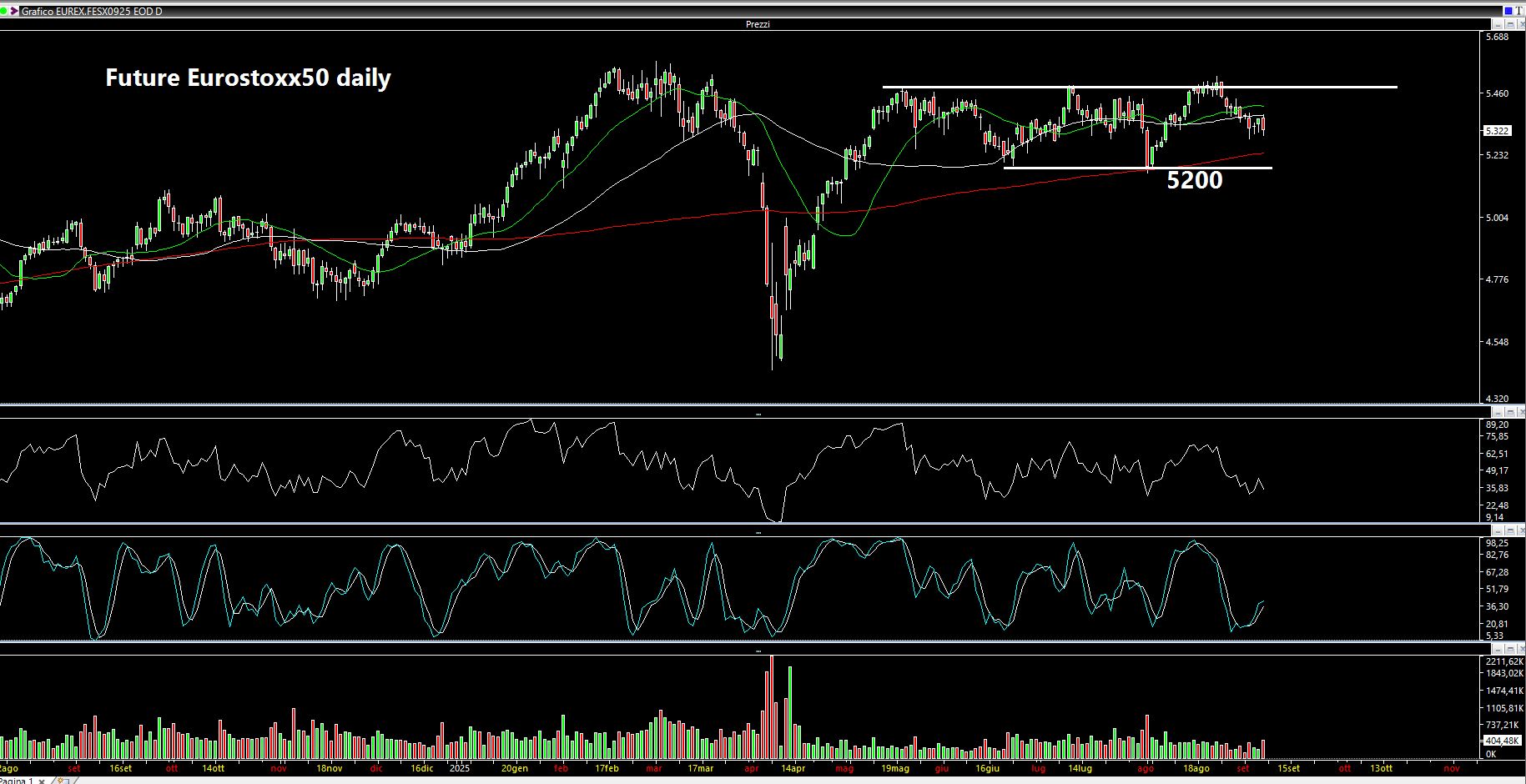 L'Eurostoxx50 future daily si trova a metà strada nel rettangolone che sta formando da qualche mese a questa parte e che vede un supporto a 5200 punti ovvero poco sotto la media mobile a 200 periodi.