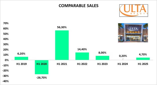 - Il dato di same store sales conferma un ritorno alla crescita organica dopo un 2024 molto più debole, dimostrando che ULTA ha recuperato slancio commerciale.
