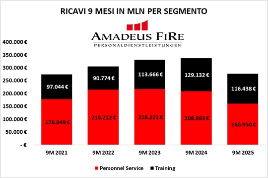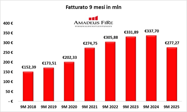 Nei primi nove mesi del 2025, AMADEUS FIRE ha registrato ricavi consolidati pari a € 277 mln, in calo del 17,9% rispetto a € 338 mln dello stesso periodo 2024.