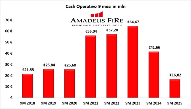 Il cash flow operativo dei nove mesi si è attestato a € 16,8 mln, contro € 41,6 mln nel 2024, risentendo sia del calo dell’EBITA sia di pagamenti fiscali riferiti ad esercizi precedenti.