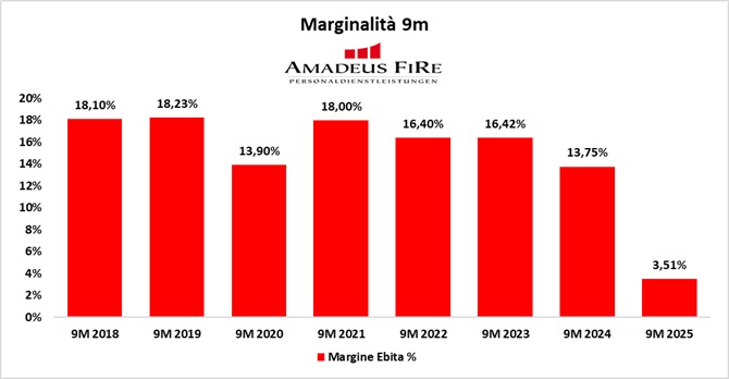 Torniamo su AMADEUS FIRE per fare il punto dopo i primi nove mesi del 2025, periodo che conferma come l’anno in corso rappresenti una delle fasi più difficili per il Gruppo dall’ultima grande crisi ciclica. Il contesto macroeconomico tedesco rimane estremamente debole e ha inciso in modo diretto sia sui volumi sia sulla redditività.
