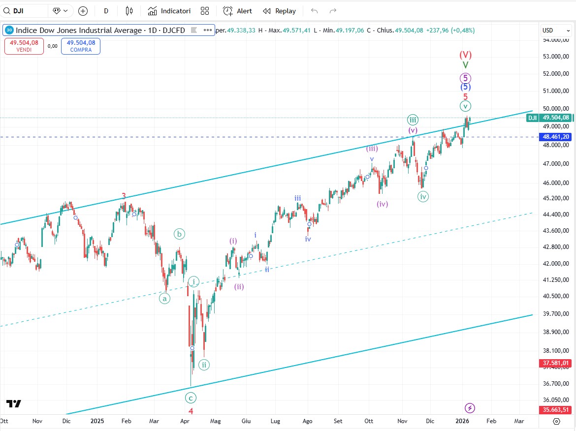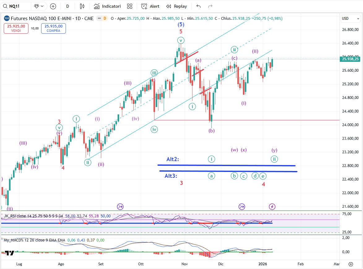 Il Nasdaq ha ritoccato di misura il precedente massimo di Dicembre e si presenta con un modello d’onda che si presta a diverse interpretazioni. Nel grafico ne ho messe tre. Anche in questo caso il primo segnale per poter cominciare a parlare di trend ribassista è la rottura al ribasso del minimo del 21 novembre etichettato come onda (b) di grado minuette. Fino a quando questo non si verifica, i modelli d’onda potranno svilupparsi in mille modi ma il trend rimane rialzista.