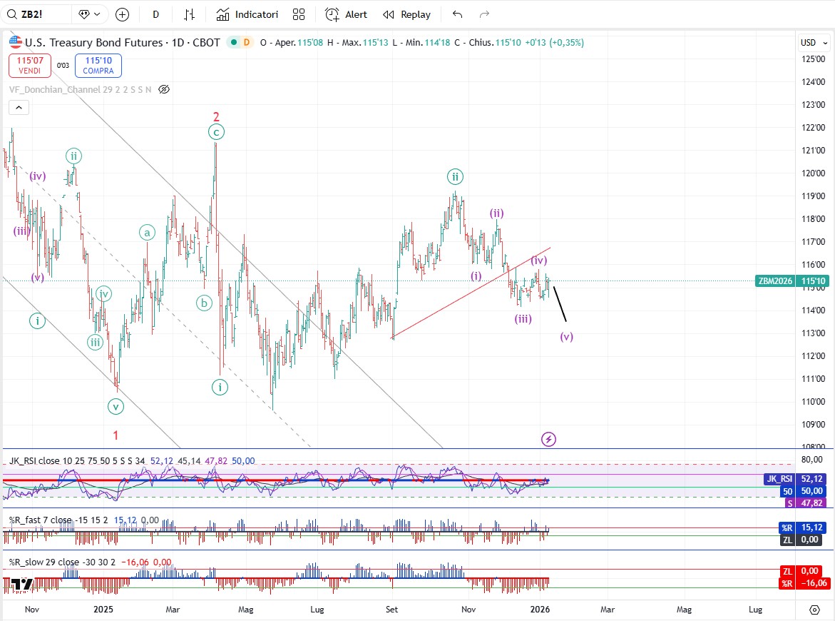 Sul trentennale i prezzi continuano ad oscillare al di sotto della linea del collo del piccolo testa e spalle e finchè non supereranno quota 116, 15 lo scenario ribassista rimane quello preferenziale con un primo target attorno ai 112,10 o poco sopra.