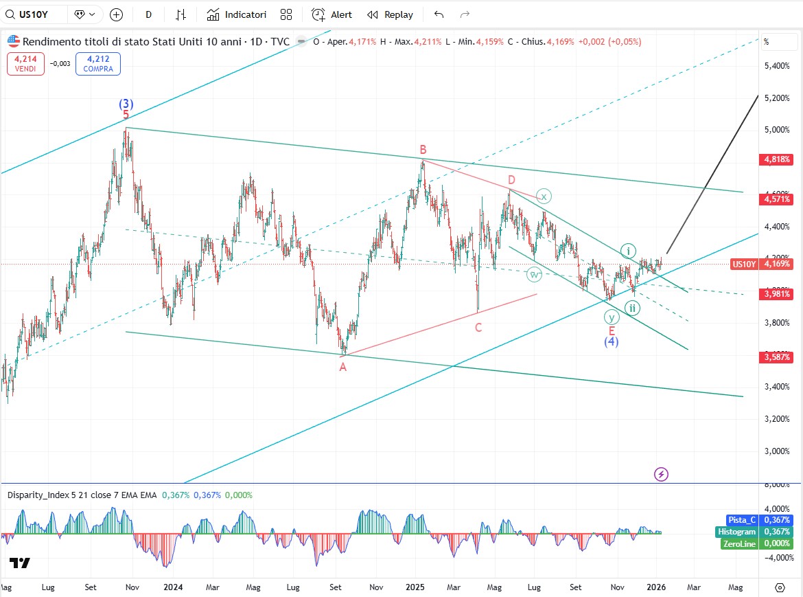 Il rendimento del decennale americano rimane nelle fasi iniziali dell'onda (5) di grado intermedio, che alla fine dovrebbe portare i rendimenti sopra al 5,021%, che era il picco della precedente onda (3).