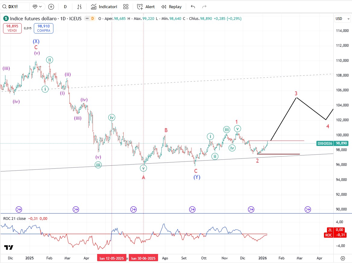 Questa settimana il Dollar Index ha messo a segno un rialzo notevole confermando il nostro conteggio che lo posiziona in onda 3. La conferma definitiva arriverà solo al superamento del massimo di onda 1 ma nel frattempo cominciamo a cercare qualche strumento per posizionarci al rialzo.