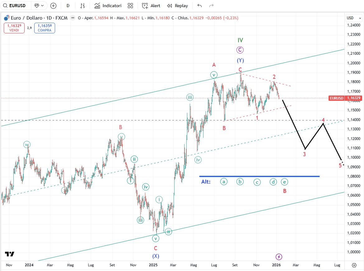 Il calo dell’euro ha portato i prezzi attorno a 1,16. Se il modello d’onda realizzerà un triangolo allora i prezzi dovrebbero scendere ancora un po' verso 1,1550-1,1530 completando l’onda [e] che chiuderebbe l’onda B di grado minor. A quel punto l’euro dovrebbe realizzare un’altra onda rialzista per realizzare l’onda C e chiudere l’onda (Y) di grado intermedio. In questo caso si realizzerebbe lo scenario alternativo. Diversamente se i prezzi scenderanno di più bucando la linea tratteggiata allora vale l’etichettatura preferenziale che vede l‘onda (Y) già conclusa ed etichetta. il pattern successivo sarà un cinque onde ribassista che trascinerà l’euro molto più in basso in zona 1,10 o anche sotto. Da seguire.