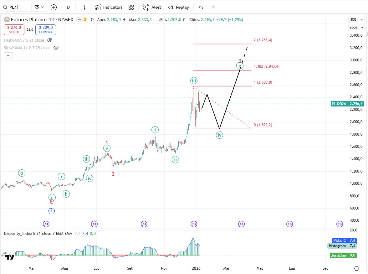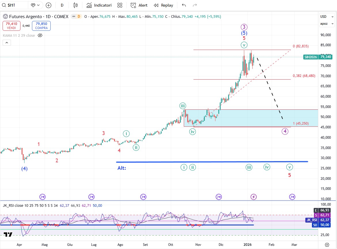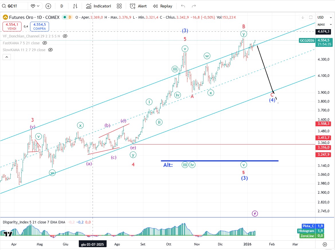 Ammesso e non concesso che l’oro sia finalmente intenzionato ad effettuare la tanto attesa correzione allora i prezzi potrebbero attestarsi in zona 4100-4200$ se la correzione svilupperà un triangolo o più in basso in zona 3800-3900$ se il pattern correttivo svilupperà un flat. Un’altra possibilità è che l’oro continui a salire un altro pò per cui ci potremmo trovare nella situazione mostrata come scenario alternativo. In questo caso il massimo di onda (3) sarebbe solo il massimo di onda [iii], il minimo di onda A sarebbe l’onda [iv] e l’onda (3) sarebbe conclusa (forse) sul massimo del 26 dicembre o potrebbe non essere ancora terminata e richiedere una ulteriore suddivisione al rialzo. Da seguire.