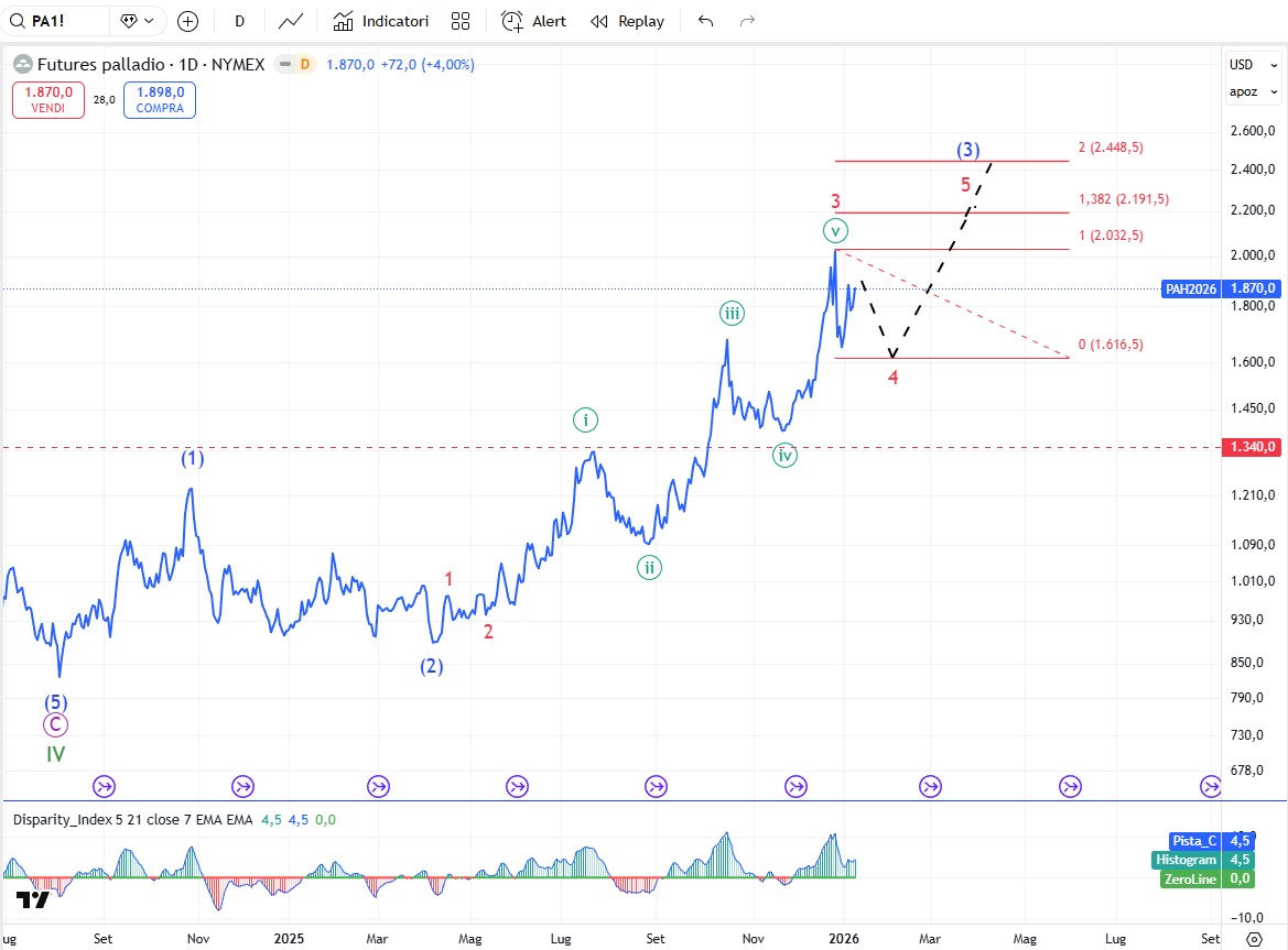 Il palladio pur mostrando meno forza dell’argento e del platino dovrebbe avere spazio anche lui per un ulteriore apprezzamento fino alla zona 2200-2400$. Per quello che riguarda la correzione in atto non dovrebbe scendere al di sotto di 1600-1620$: