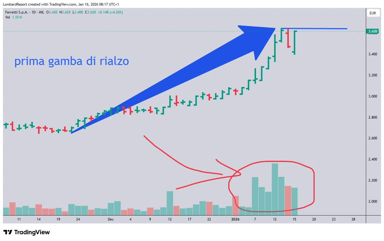 FERRETTI: un trade dei matti, ora abbiamo un punto che ci segnala lo stop loss e se questa è la prima gamba del rialzo figuratevi le altre due. Astenersi deboli di cuore e non metteteci la liquidazione della mamma ma un chip pesato per il rischio che è enorme. Compriamo 3.64, target 5.5 (da aggiornare, solito ribaltamento del box di congestione), stop loss 3.32