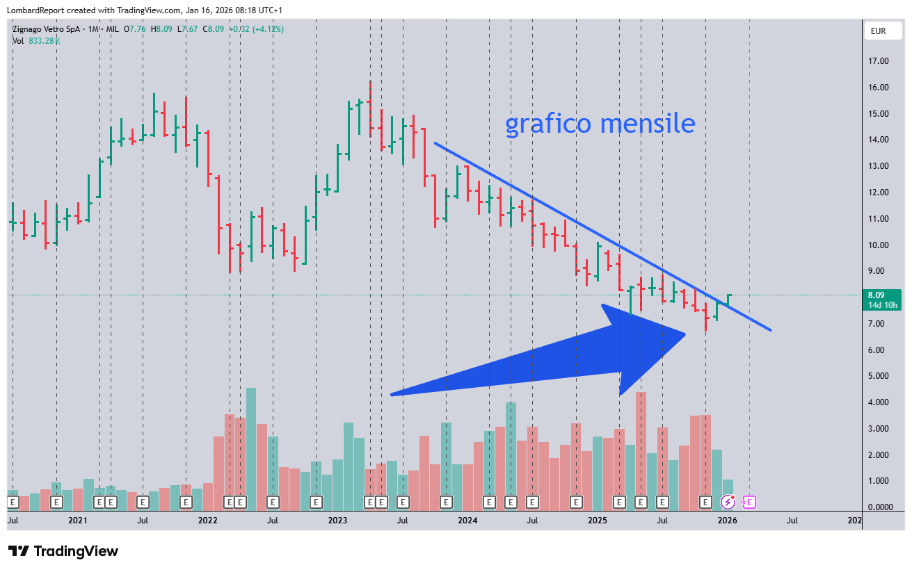 ZIGNAGO VETRO: una azione che è primo posto come ROIC – WACC stabile che sembra il cornicione di un portone. Sembra che il mercato si stia ricordando di lei, rottura di trendline al rialzo ? Sicuramente i volumi pompano alla grande …