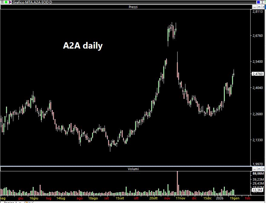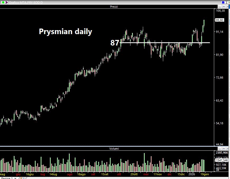 Se la fortuna è cieca (A2A), la sfortuna ci ha visto benissimo su Prysmian. Per due sedute la chiusura è stata poco sotto 87 euro....poi il titolo è decollato chiudendo la settimana a 95,80. A dir poco frustrante.